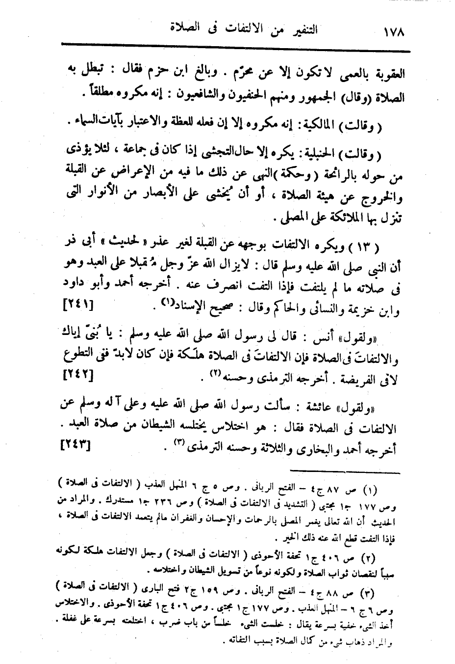 (¬2) ص 406 ج 1 تحفة الأحوذى (الالتفات فى الصلاة) وجعل الالتفات هلكة لكونه سبباً لنقصان ثواب الصلاة ولكونه نوعاً من تسويل الشيطان واختلاسه.