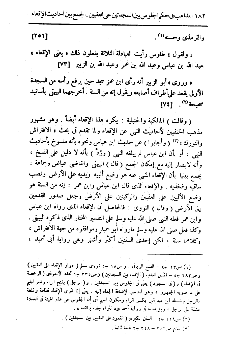 (وقالت) المالكية والحنبلية: يكره هذا الإقعاء أيضاً. وهو مشهور مذهب الحنفيين لأحاديث النهى عن الإقعاء ولما تقدم فى بحث " الافتراش والتورك " (¬3) (وأجابوا) عن حديث ابن عباس ونحوه بأنه منسوخ بأحاديث النهى، أو بأن ابن عباس لم يبلغه النهى (ورُدَّ) بأنه لا دليل على النسخ، وأنه لا يصار إليه مع إمكان الجمع (قال) البيهقى والقاضى عياض وجماعة: يجمع بينها بأن الإقعاء المنهى عنه هو وضع ألييه ويديه على الأرض ونصب ساقيه وفخذيه. والإقعاء الذى قال ابن عباس وابن عمر: إنه من السنة هو وضع الأليين على العقبين والركبتين على الأرض وجعل صدور القدمين إلى الأرض (وقال) النووى: فالحاصل أن الإقعاء الذى رواه ابن عباس وابن عمر فعله النبى صلى الله عليه وسلم على التفسير المختار الذى ذكره البيهقى. وكذا فعل صلى الله عليه وسلم ما رواه أبو حميدٍ وموافقوه من جهة الافتراش، وكلاهما سنة، لكن إحدى السنتين أكثر وأشهر وهى رواية أبى حُميد،