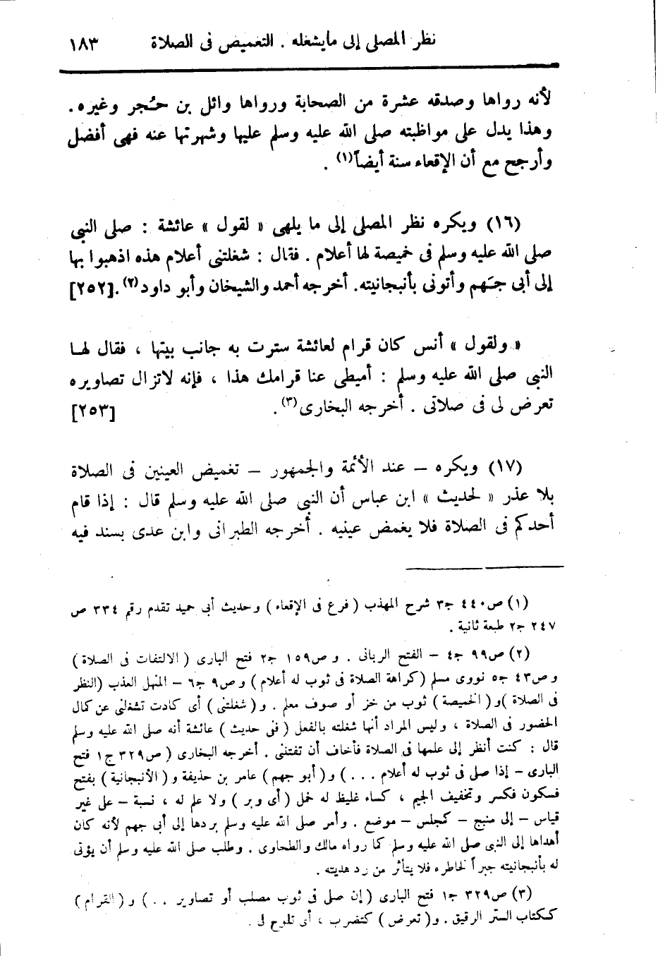 (16) ويكره نظر المصلى على ما يلهى " لقول " عائشة: صلى النبى صلى الله عليه وسلم فى خميصة لها أعلام. فقال: شغلتنى أعلام هذه اذهبوا بها إلى أبى جَهم وأتونى بأنيجانيته. أخرجه أحمد والشيخان وأبو داود. (¬2) {252}