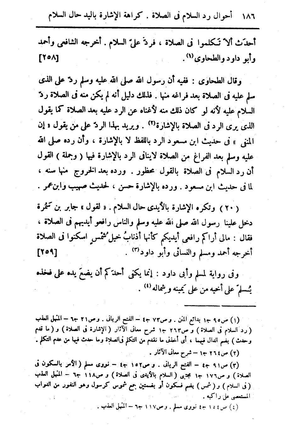 أحدَث ألاّ تَكلموا فى الصلاة، فردّ علىّ السلام. أخرجه الشافعى وأحمد وأبو داود والطحاوى (¬1). {258}