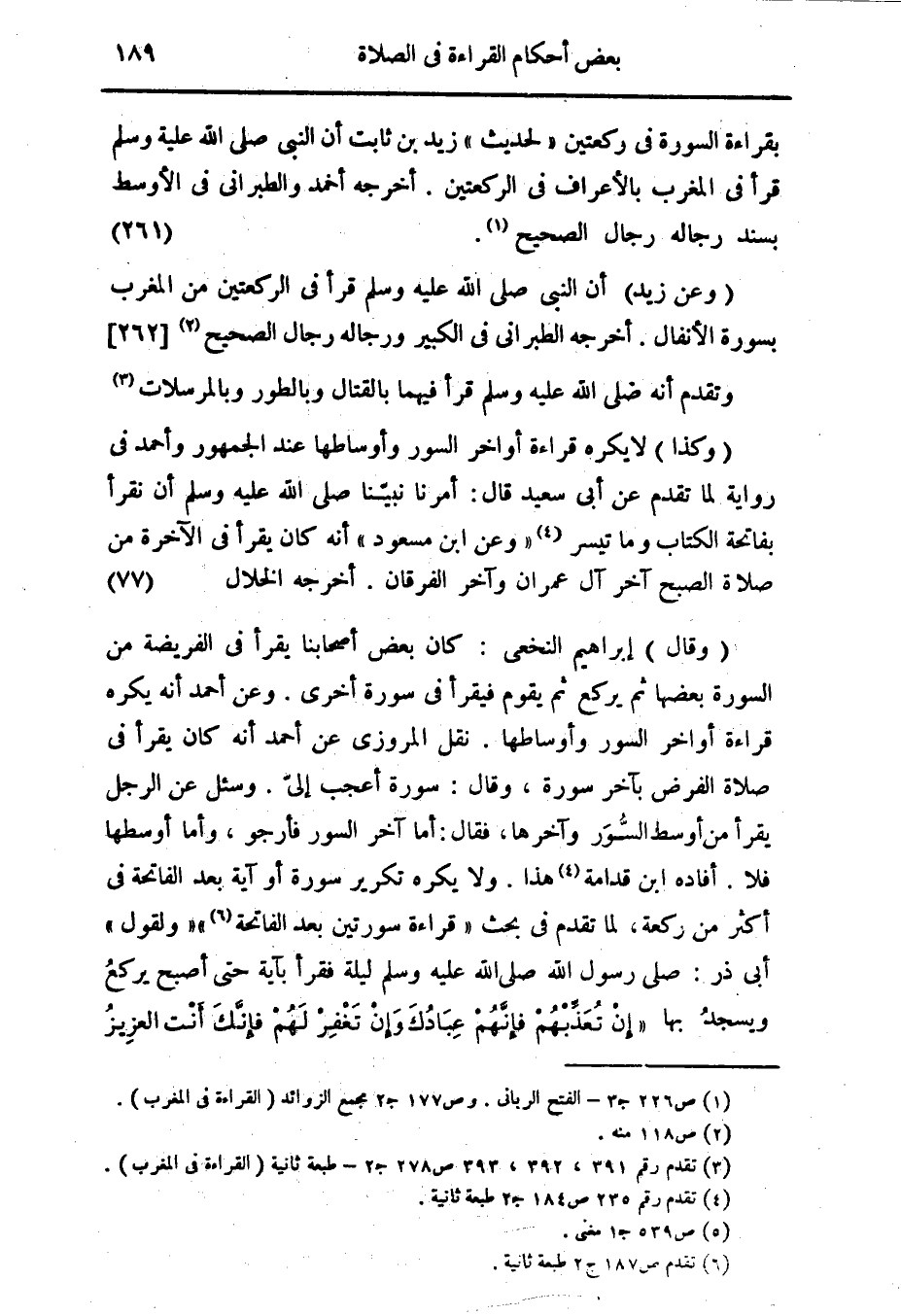 بقراءة السورة فى ركعتين " لحديث " زيد بن ثابت أن النبى صلى الله عليه وسلم قرأ فى المغرب بالأعراف فى الركعتين. أخرجه أحمد والطبرانى فى الأوسط بسند رجاله رجال الصحيح (¬1). {261}