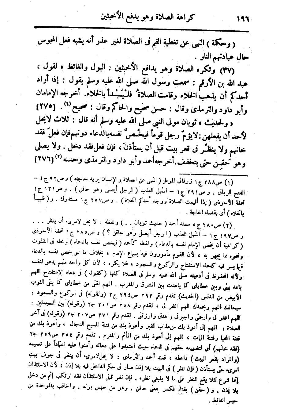 (37) وتكره الصلاة وهو يدافع الأخبثين: البول والغائط " لقول " عبد الله بن الأرقم: سمعت رسول الله صلى الله عليه وسلم يقول: إذا أراد أحدكم أن يذهب الخلاء وقامت الصلاةُ فلْيَبْدأ بالخلاء. أخرجه الإمامان وأبو داود والترمذى وقال: حسن صحيح والحاكم وقال: صحيح (¬1). {275}