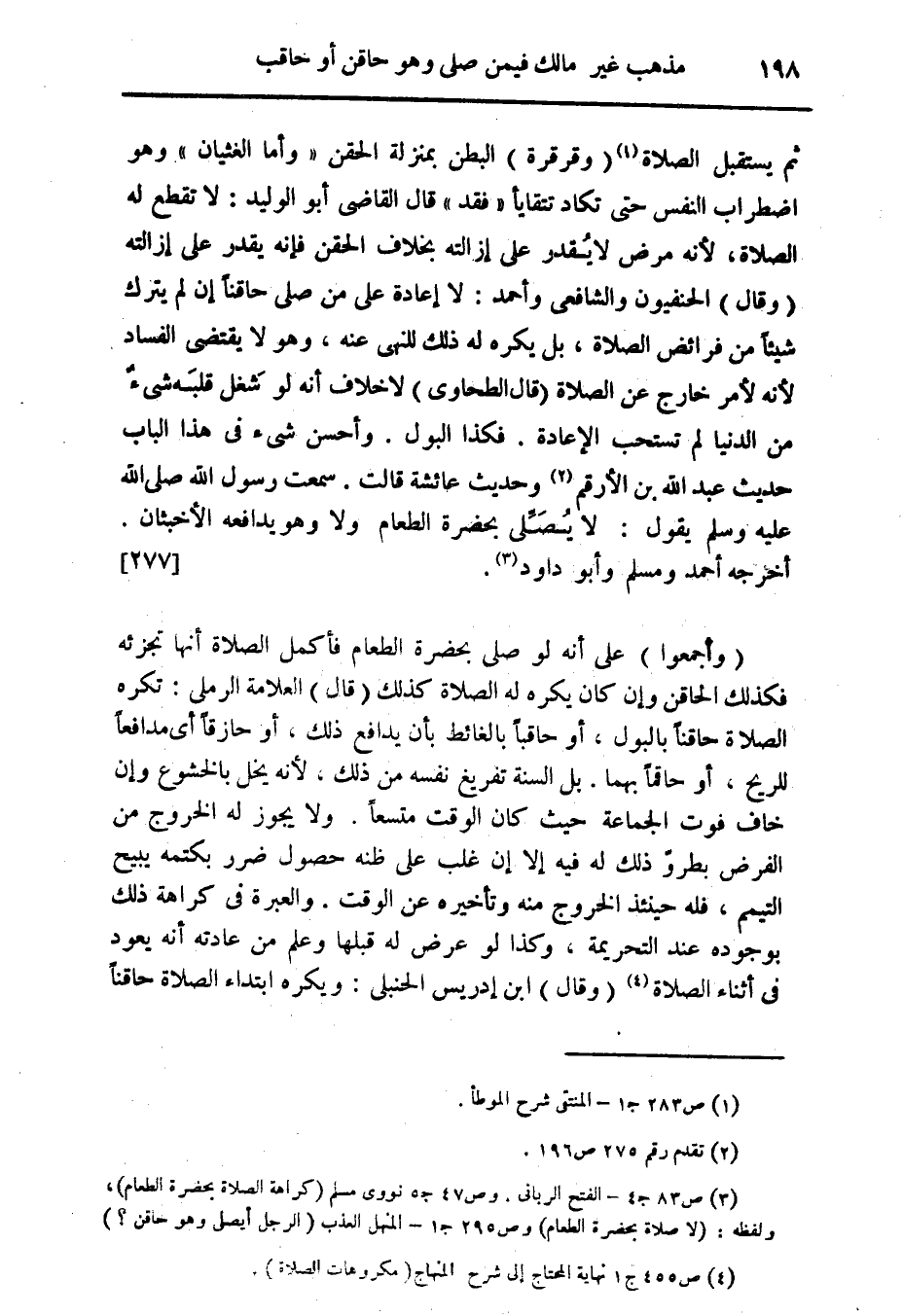 (وأجمعوا) على أنه لو صلى بحضرة الطعام فأكمل الصلاة أنها تجزئه فكذلك الحاقن وإن كان يكره له الصلاة كذلك (قال) العلامة الرملى: تكره الصلاة حاقناً بالبول، أو حاقباً بالغائط بأن يدافع ذلك، أو حازقاً أى مدافعاً للريح، أو حاقماً بهما. بل السنة تفريغ نفسه من ذلك، لأنه يخل بالخشوع وإن خاف فوت الجماعة حيث كان الوقت متسعاً. ولا يجوز له الخروج من الفرض بطروّ ذلك له فيه إلا إن غلب على ظنه حصول ضرر بكتمه يبيح التيمم، فله حينئذ الخروج منه وتأخيره عن الوقت. والعبرة فى كراهة ذلك بوجوده عند التحريمة، وكذا لو عرض له قبلها وعلم من عادته أنه يعود فى أثناء الصلاة (¬4) (وقال) ابن إدريس الحنبلى: ويكره ابتداء الصلاة حاقناً