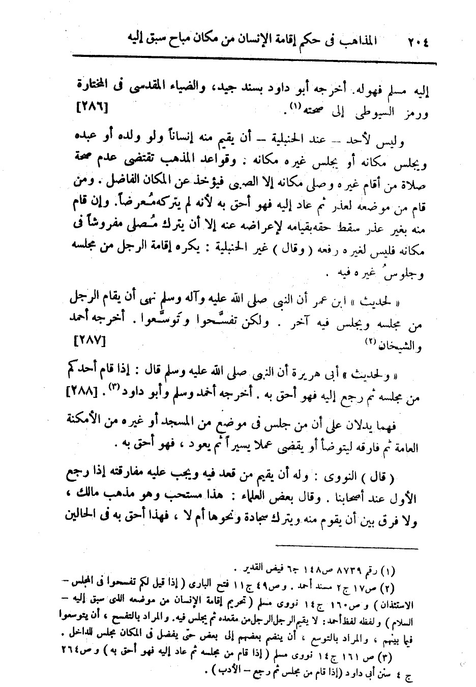 (¬3) ص 161 ج 14 نووى مسلم (إذا قام من مجلسه ثم عاد إليه فهو أحق به) وص 264 ج 4 سنن أبى داود (إذا قام من مجلس ثم رجع - الأدب).