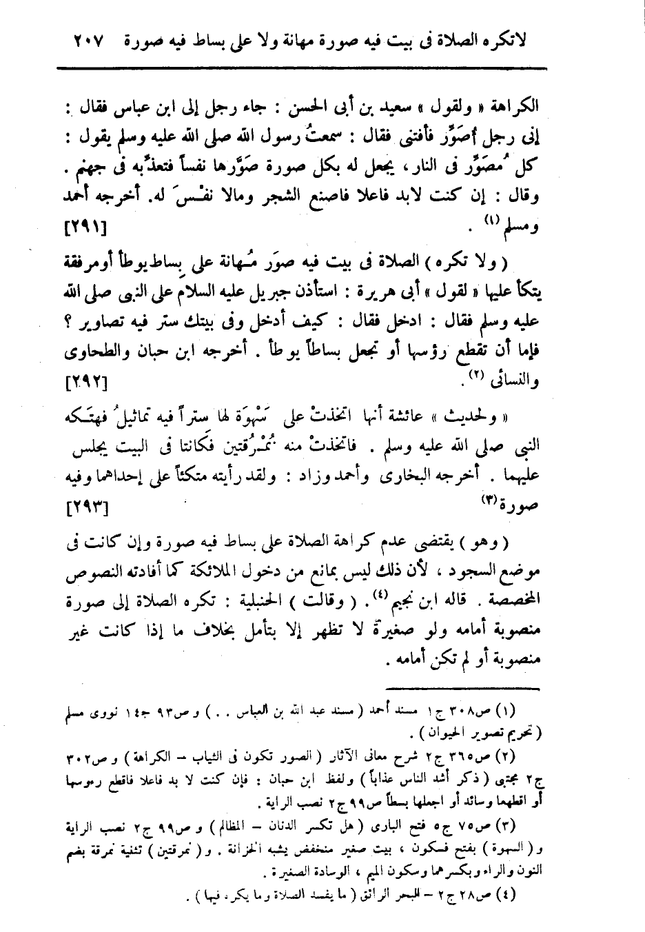 الكراهة " ولقول " سعبد بن أبى الحسن: جاء رجل إلى ابن عباس فقال: إنى رجل أُصَوِّر فأفتنى فقال: سمعتُ رسول الله صلى الله عليه وسلم يقول: كل مُصَوِّر فى النار، يجعل له بكل صورة صَوَّرها نفساً فتعذِّبه فى جنهم. وقال: إن كنت لابد فاعلا فاصنع الشجر ومالا نفْسَ له. أخرجه أحمد ومسلم (¬1). {291}