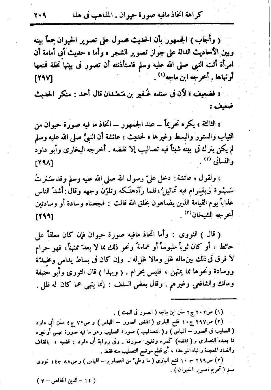 " الثالثة " يكره تحريماً - عند الجمهور - اتخاذ ما فيه صورة حيوان من الثياب والستور والبسط وغيرها "لحديث" عائشة أن النبىَّ صلى الله عليه وسلم لم يكن يترك فى بيته شيئاً فيه تصاليب إلا نقضه. أخرجه البخارى وأبو داود والنسائى (¬2). {298}