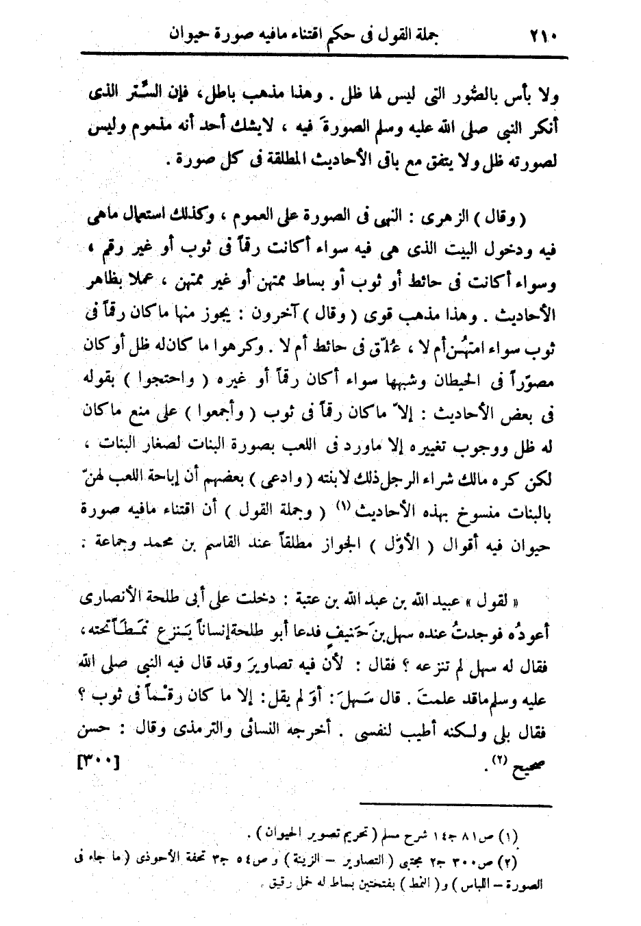 " لقول " عبيد الله بن عبد الله بن عتبة: دخلت على أبى طلحة الأنصارى أعودُه فوجدتُ عنده سهل بنَ حنَيفٍ فدعا أبو طلحة إنساناً يَنزع نمَطَاً تحته، فقال له سهل لم تنزعه؟ فقال: لأن فيه تصاويرَ وقد قال فيه النبى صلى الله عليه وسلم ما قد علمتَ. قال سَهلَ: أوَ لم يقل: إلا ما كان رقْماً فى ثواب؟ فقال بلى ولكنه أطيب لنفسى. أخرجه النسائى والترمذى وقال: حسن صحيح (¬2). {300}