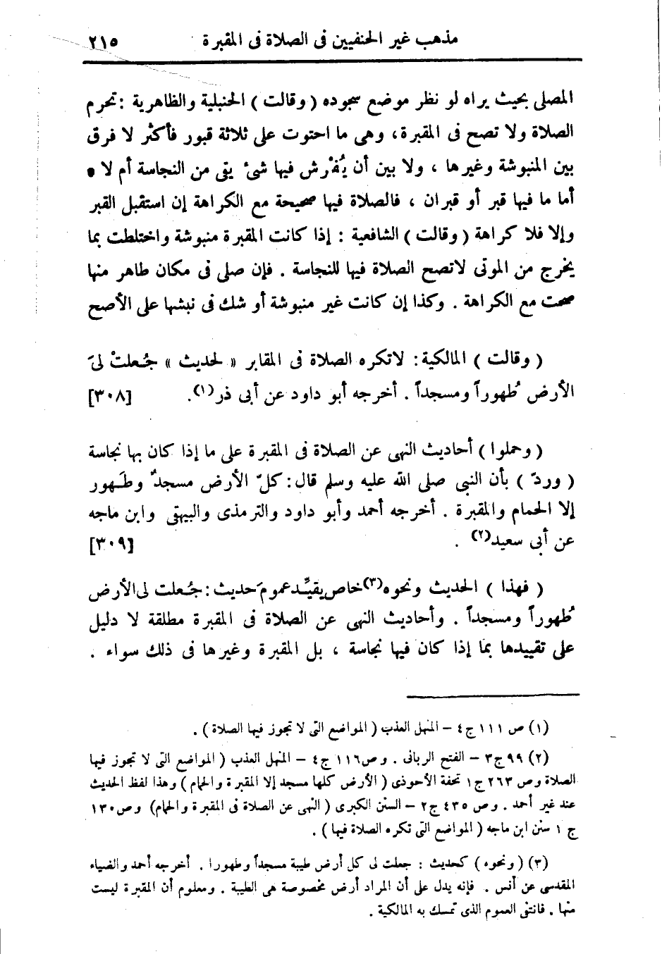 (وحملوا) أحاديث النهى عن الصلاة ف المقبرة على ما إذا كان بها نجاسة (وردّ) بأن النبى صلى الله عليه وسلم قال: كلّ الأرض مسجدٌ وطَهور إلا الحمام والمقبرة. أخرجه أحمد وأبو داود والترمذى والبيهقى وابن ماجه عن أبى سعيد (¬2). {309}