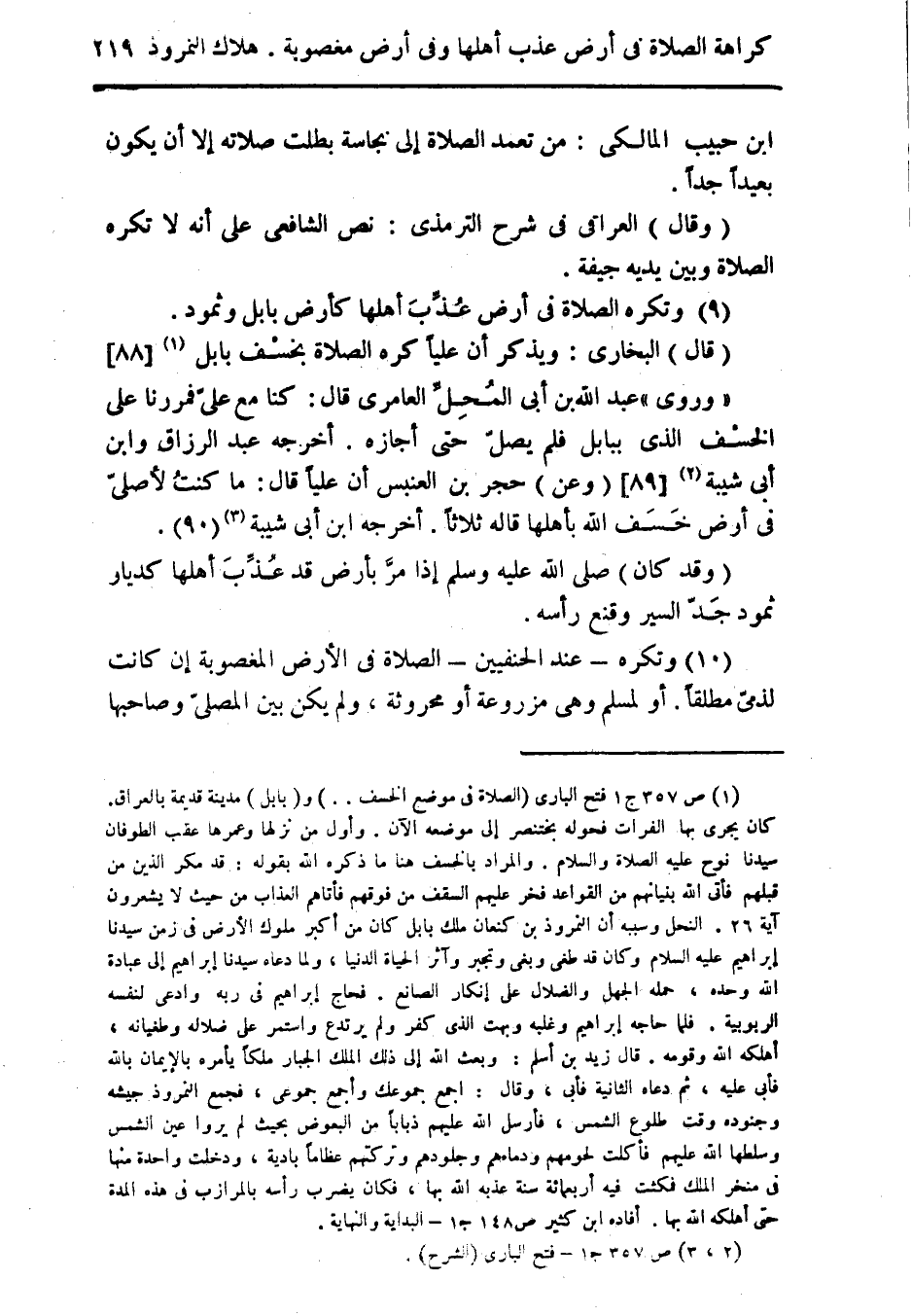 (9) وتكره الصلاة فى أرض عُذِّبَ أهلها كأرض بابل وثمود.