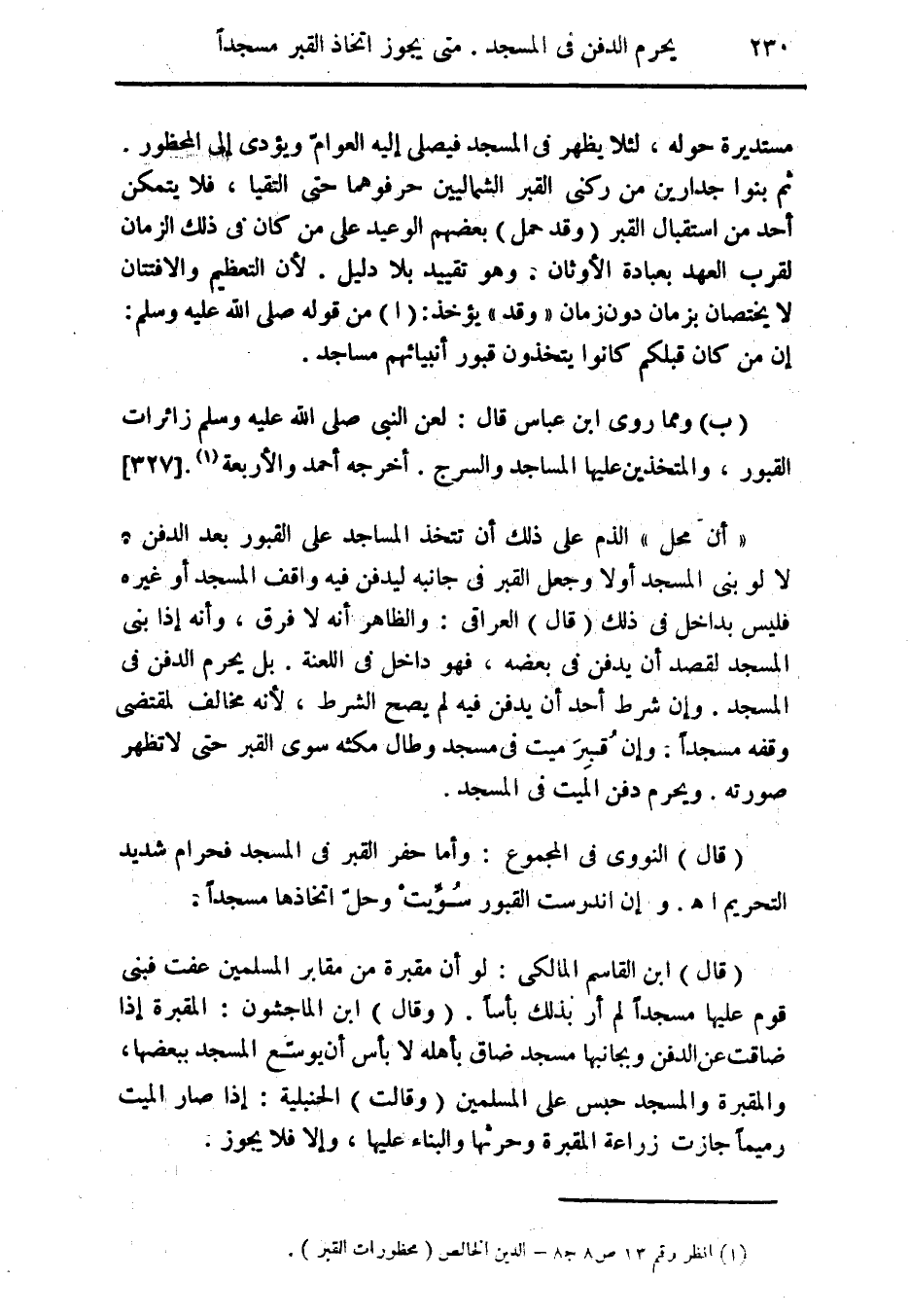 " أن محل " الذم على ذلك أن تتخذ المساجد على القبور بعد الدفن، لا لو بنى المسجد أوى وجعل القبر فى جانبه ليدفن فيه واقف المسجد أو غيره فليس بداخل فى ذلك (قال) العراقى: والظاهر أنه لا فرق، وأنه إذا بنى المسجد لقصد أن يدفن فى بعضه، فهو داخل فى اللعنة. بل يحرم الدفن فى المسجد. وإن شرط أحد أن يدفن فيه لم يصح الشرط، لأنه مخالف لمقتضى وقفه مسجداً. وإن قُبِرَ ميت فى مسجد وطال مكثه سوى القبر حتى لا تظهر صورته. ويحرم دفن الميت فى المسجد.