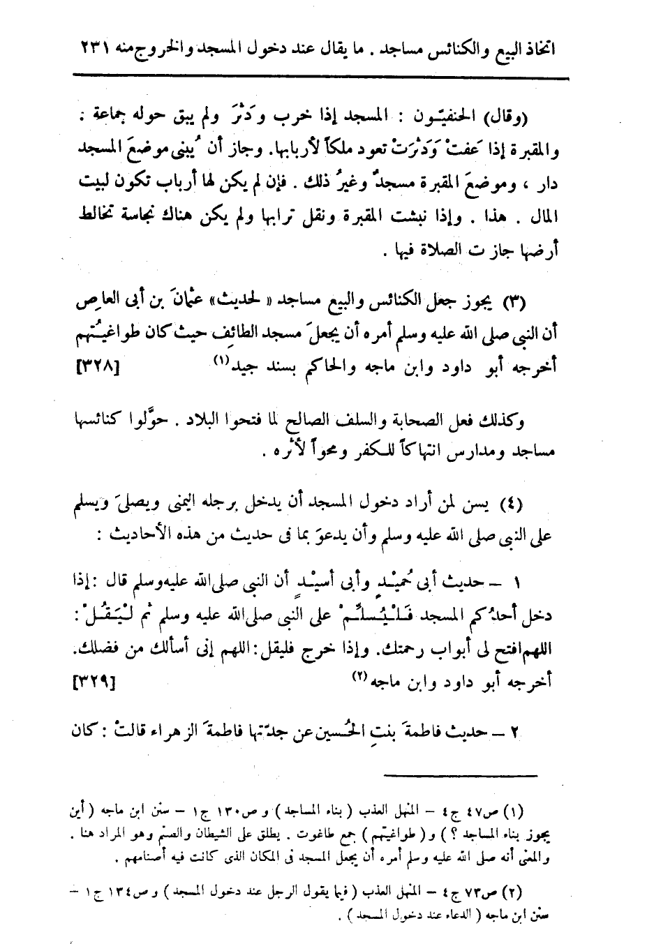(3) يجوز جعل الكنائس والبيع مساجد " لحديث " عثمانَ بن أبى العاِص أن النبى صلى الله عليه وسلم أمره أن يجعلَ مسجد الطاِئف حيث كان طواغيُتهم أخرجه أبو داود وابن ماجه والحاكم بسند جيد (¬1). {328}