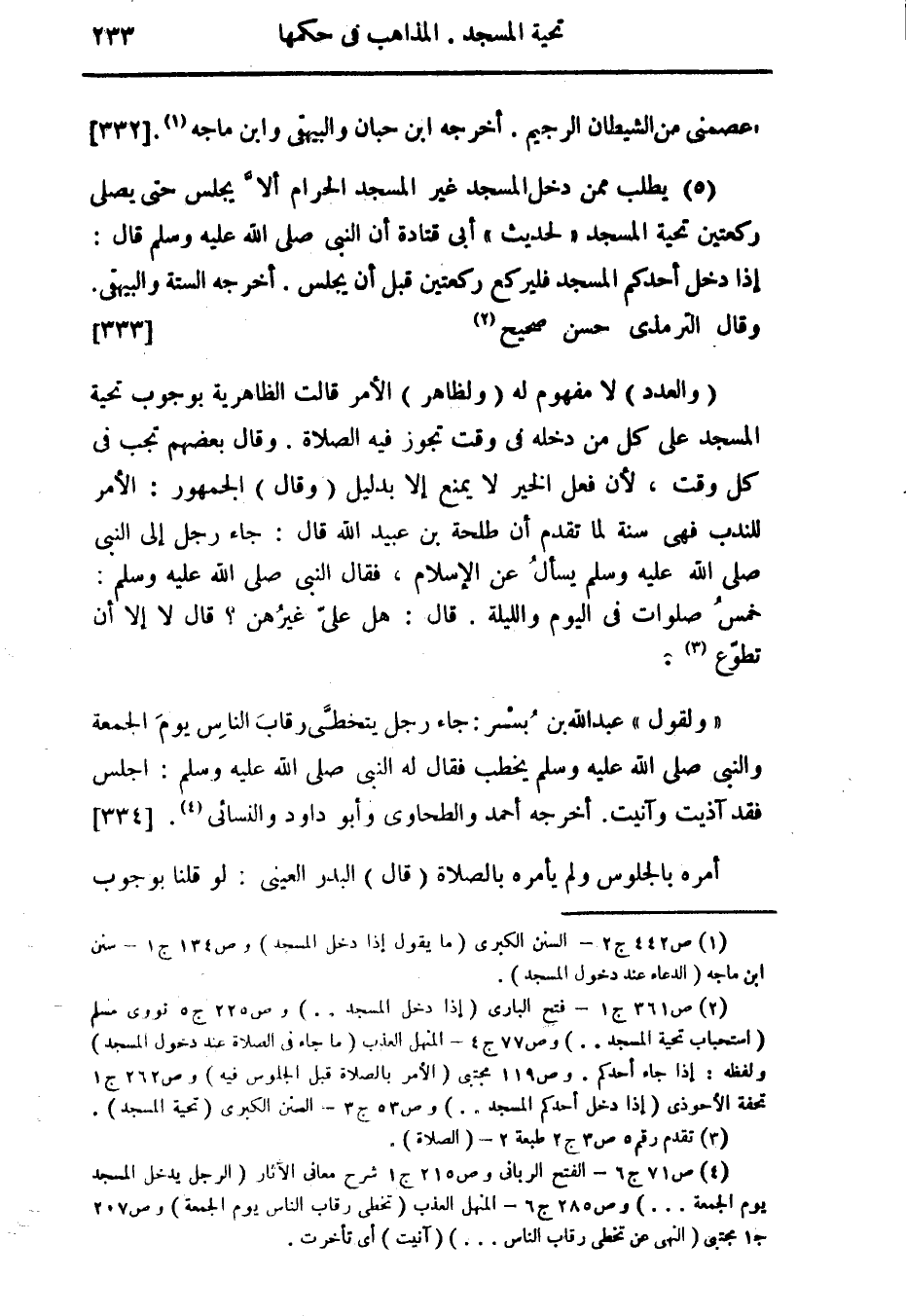 (5) يطلب ممن دخل المسجد غير المسجد الحرام ألاَّ يجلس حتى يصلى ركعتين تحية المسجد " لحديث " أبى قتادة أن النبى صلى الله عليه وسلم قال: إذا دخل أحدكم المسجد فليركع ركعتين قبل أن يجلس. أخرجه الستة والبيهقى وقال الترمذى حسن صحيح (¬2). {333}