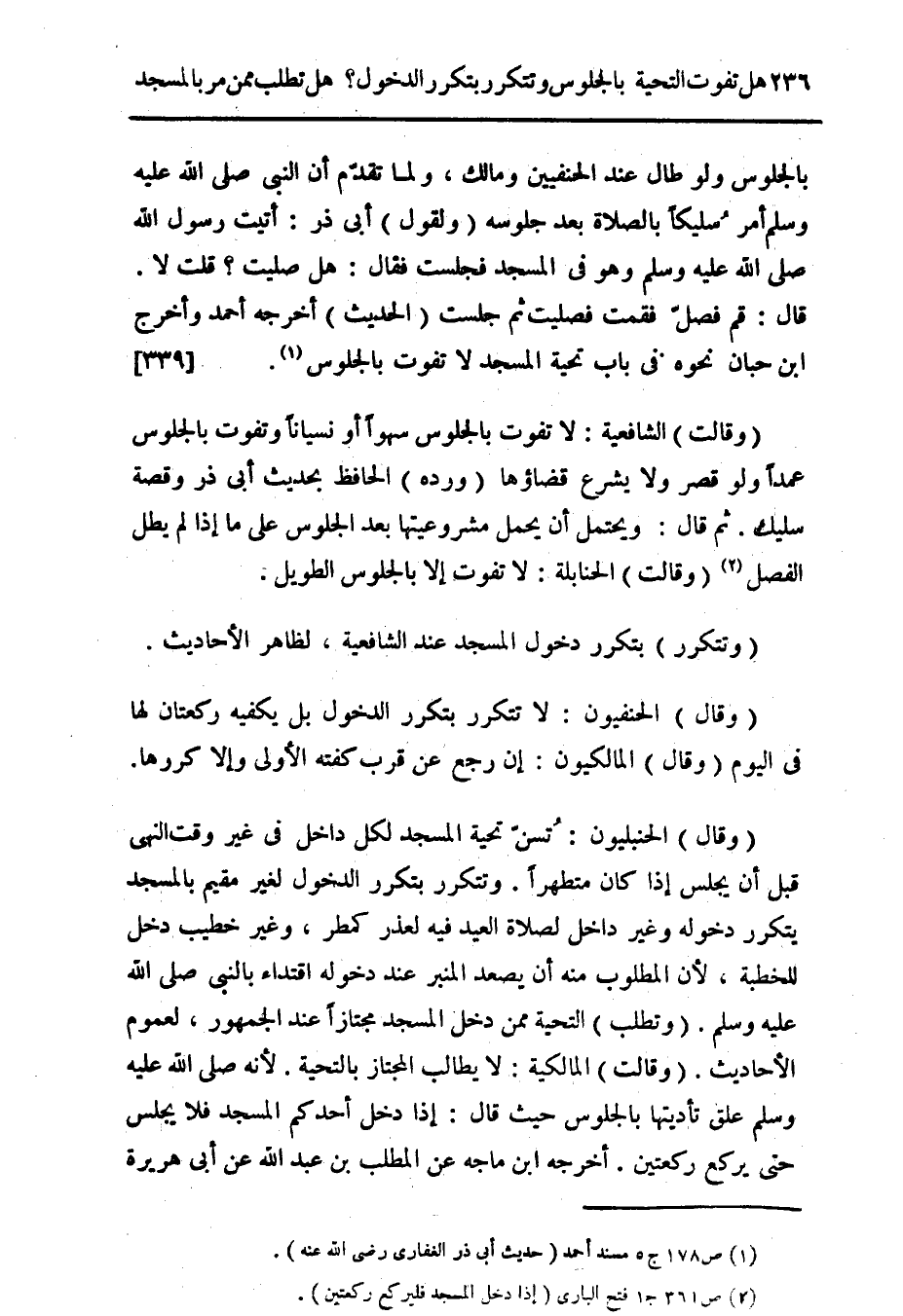 (وقال) الحنفيون: لا تتكرر بتكرر الدخول بل يكفيه ركعتان لها فى اليوم (وقال) المالكيون: إن رجع