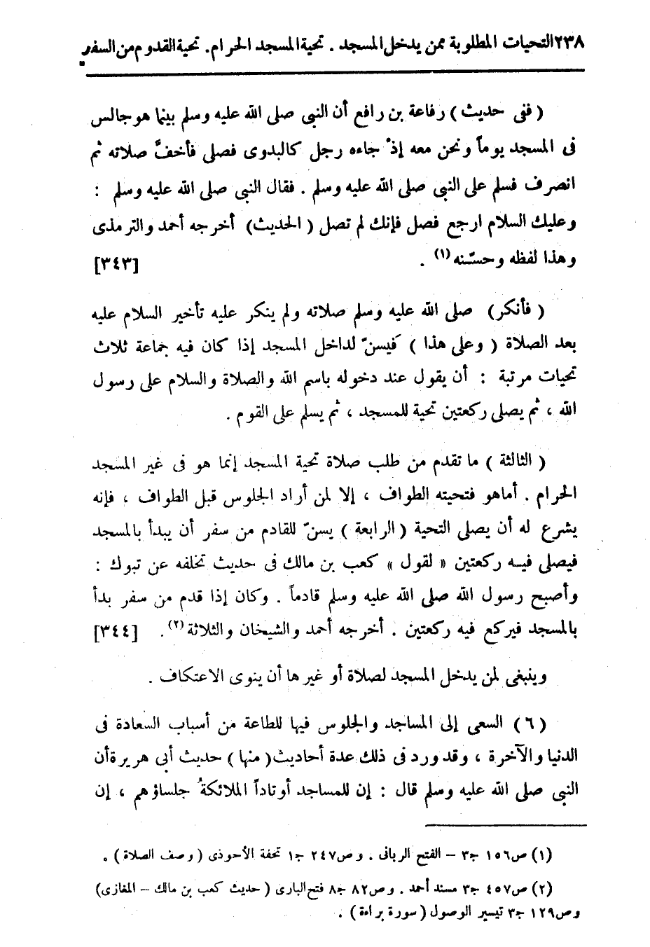 (الثالثة) ما تقدم من طلب صلاة تحية المسجد إنما هو فى غير المسجد الحرام. أما هو فتحيته الطواف، إلا لمن أراد الجلوس قبل الطواف. فإنه يشرع له أن يصلى التحية (الرابعة) يسنّ للقادم من سفر أن يبدأ بالمسجد فيصلى فيه ركعتين " لقول " كعب بن مالك فى حديث تخلفه عن تبوك: وأصبح رسول الله صلى الله عليه وسلم قادماً. وكان إذا قدم من سفر بدأ بالمسجد فيركع فيه ركعتين. أخرجه أحمد والشيخان والثلاثة (¬2). {344}