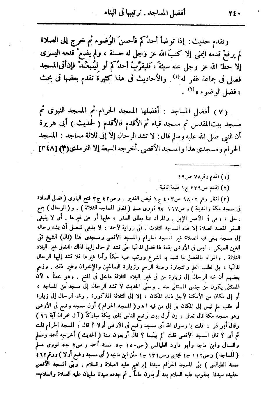 (7) أفضل المساجد: أفضلها المسجد الحرام ثم المسجد النبوى ثم مسجد بيت المقدس ثم مسجد قباء ثم القدم فالأقدم (لحديث) أبى هريرة أن النبى صلى الله عليه وسلم قال: لا تشد الرحال إلا إلى ثلاثة مساجد: المسجد الحرام ومسجدى هذا والمسجد الأقصى. أخرجه السبعة إلا الترمذى (¬3). {348}