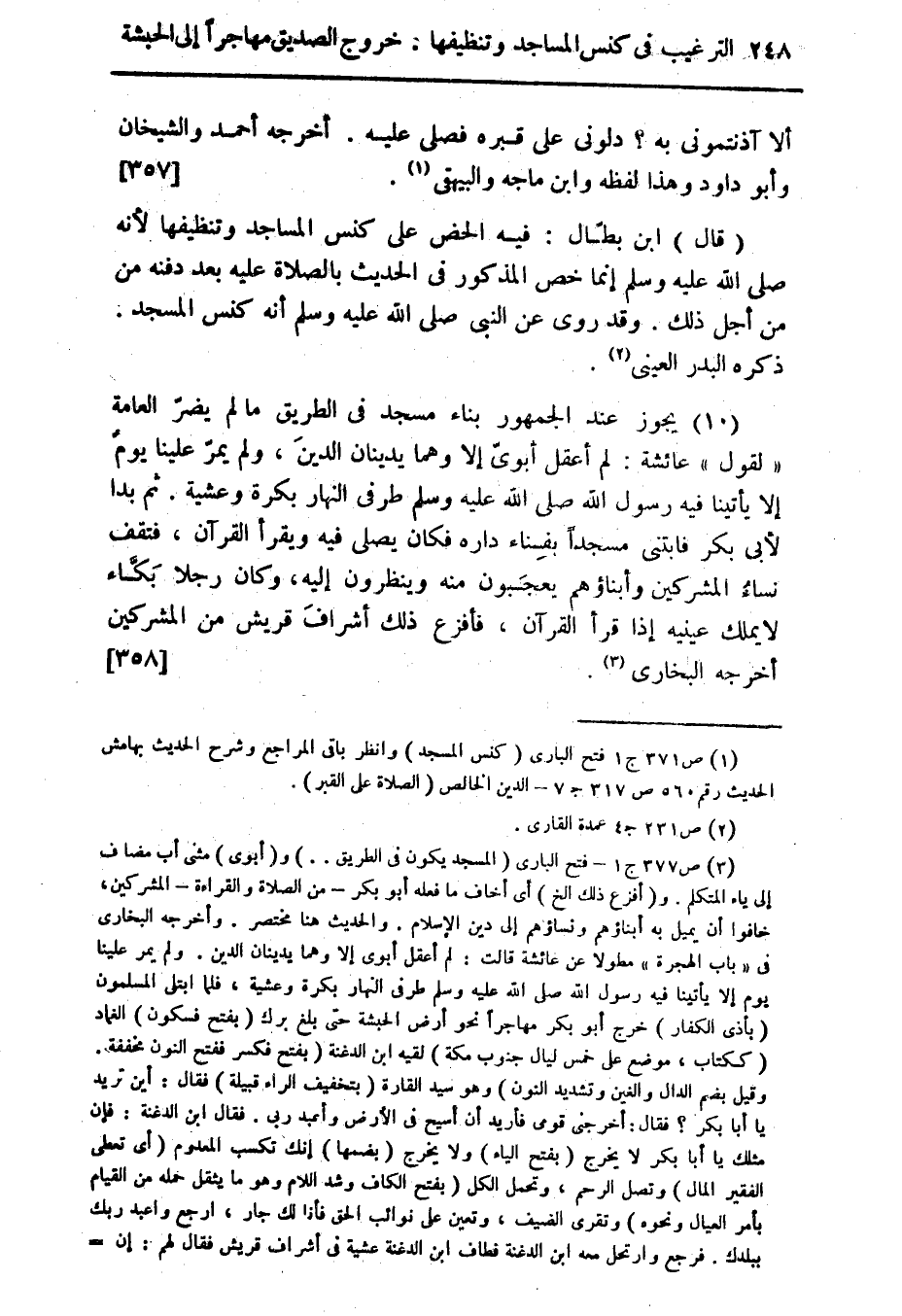 (10) يجوز عند الجمهور بناء مسجد فى الطريق ما لم يضرّ العامة " لقول " عائشة: لم أعقل أبوىّ إلا وهما يدينان الدينَ، ولم يمرّ علينا يومٌ إلا يأتينا فيه رسول الله صلى الله عليه وسلم طرفى النهار بكرة وعشية. ثم بدا لأبى بكر فابتنى مسجداً بفِناء داره فكان يصلى فيه ويقرأ القرآن، فتقف نساءُ المشركين وأبناؤهم يعجَبون منه وينظرون إليه، وكان رجلا بَكَّاء لا يملك عينيه إذا قرأ القرآن، فأفزع ذلك أشرافَ قريش من المشركين أخرجه البخارى (¬3). . {358}