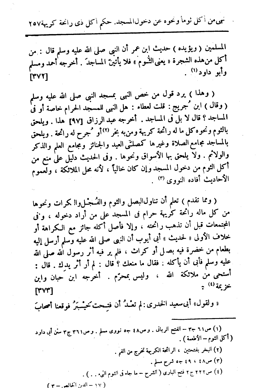 (¬1) ص 61 ج 3 - الفتح الربانى. وص 48 ج 5 نووى مسلم. ص 361 ج 3 سنن أبى داود (أكل الثوم - الأطعمة).