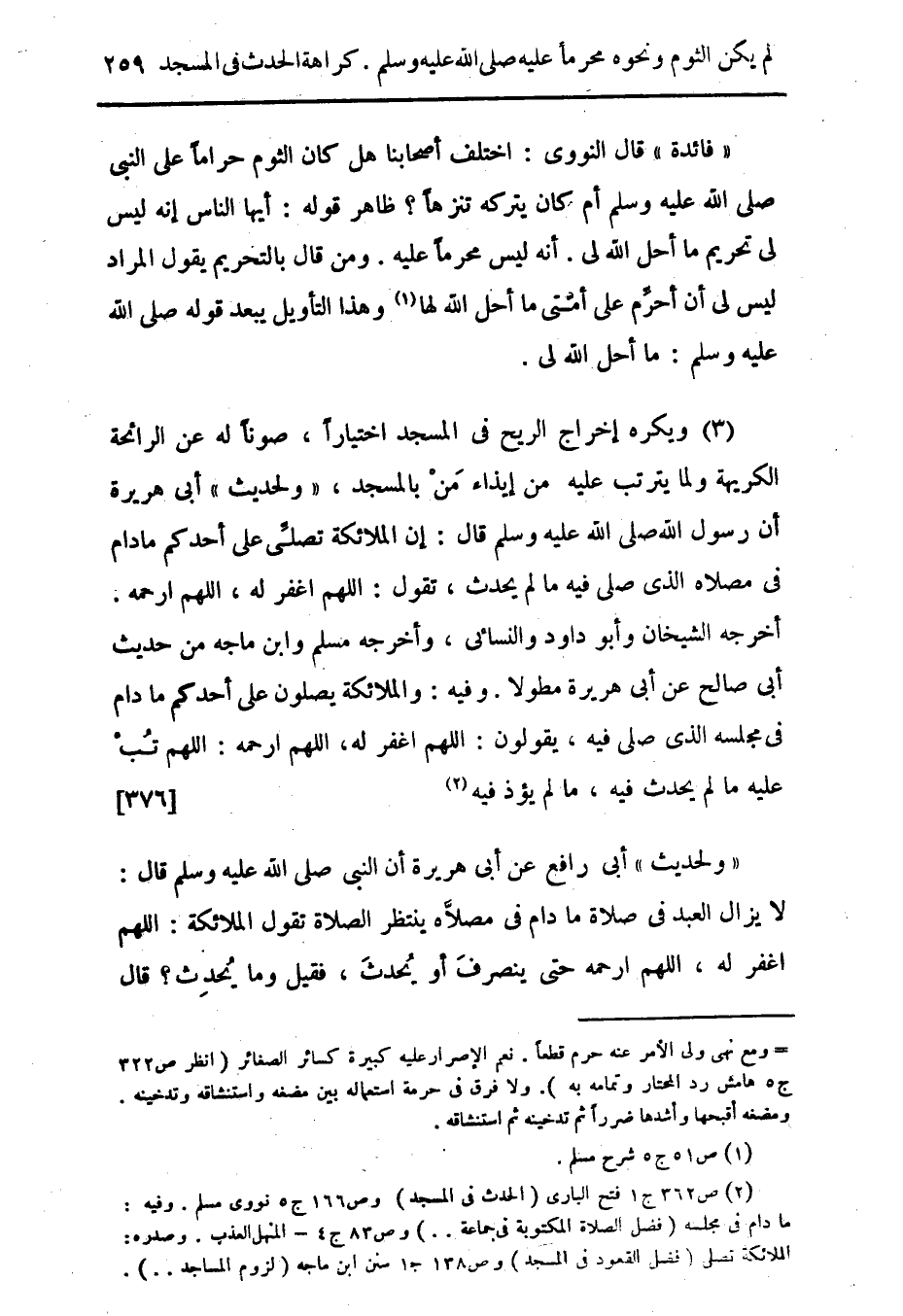 (3) ويكره إخراج الريح فى المسجد اختياراً، صوناً له عن الرائحة الكريهة ولما يترتب عليه من إيذاء مَنْ بالمسجد، " ولحديث " أبى هريرة أن رسول الله صلى الله عليه وسلم قال: إن الملائكة تصلِّى على أحدكم مادام فى مصلاه الذى صلى فيه ما لم يحدث، تقول: اللهم اغفر له، اللهم ارحمه. أخرجه الشيخان وأبو داود والنسائى، وأخرجه مسلم وابن ماجه من حديث أبى صالح عن أبى هريرة مطولا. وفيه: والملائكة يصلون على أحدكم ما دام فى مجلسه الذى صلى فيه، يقولون: اللهم اغفر له، اللهم ارحمه: اللهم تُبْ عليه من لم يحدث فيه، ما لم يؤذ فيه (¬2). {376}