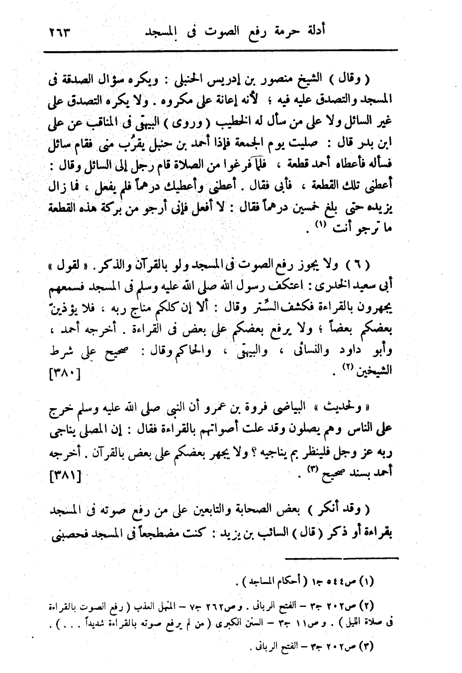 (6) ولا يجوز رفع الصوت فى المسجد ولو بالقرآن والذكر. " لقول " أبى سعيد الخدرى: اعتكف رسول الله صلى الله عليه وسلم فى المسجد فسمعهم يجهرون بالقراءة فكشف السِّتر وقال: ألا إن كلكم مناج ربه، فلا يؤذينّ بعضكم بعضاً، ولا يرفع بعضكم على بعض فى القراءة. أخرجه أحمد وأبو داود والنسائى، والبيهقى، والحاكم وقال: صحيح على شرط الشيخين (¬2). {380}