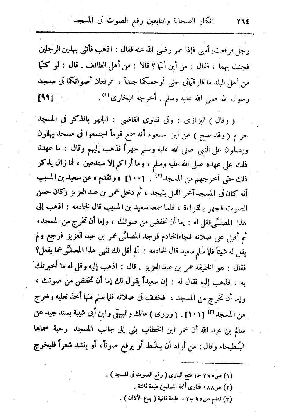رجل فرفعت رأسى فإذا عمر رضى الله عنه فقال: اذهب فأتنى بهذين الرجلين فجئت بهما، فقال: من أين أنتما؟ قالا: من أهل الطائف. قال: لو كنتما من أهل البلد ما فارقتمانى حتى أوجعتكما جلداً، ترفعان أصواتكما فى مسجد رسول الله صلى الله عليه وسلم. أخرجه البخارى (¬1). {99}