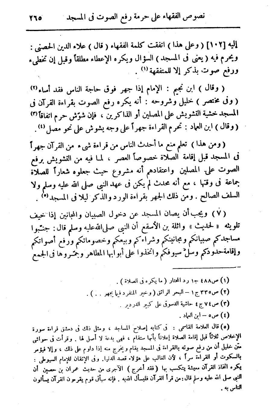 (ومن هذا) تعلم منع ما أحدث الناس من قراءة شئ من القرآن جهراً فى المسجد قبل إقامة الصلاة خصوصاً العصر، لما فيه من التشويش برفع الصوت على المصلين واعتقادهم أنه مشروع حيث جعلوه شعاراً للصلاة جماعة فى وقتها، مع أنه محدث لم يكن فى عهد النبى صلى الله عليه وسلم ولا السلف الصالح. ومن ذلك الجهر بقراءة الورد والذكر ليلا فى المسجد (¬5).