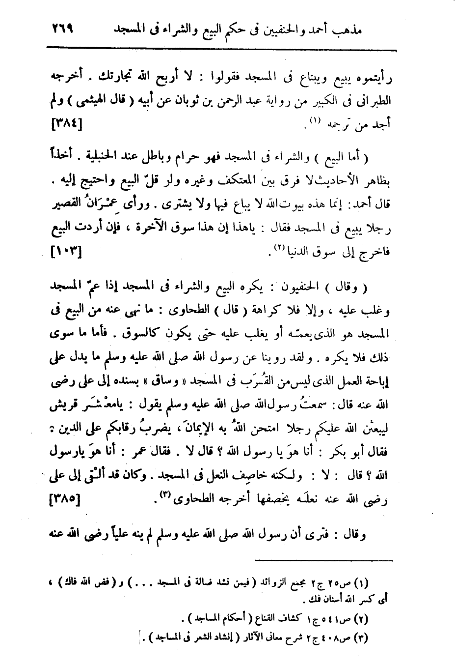 (أما البيع) والشراء فى المسجد فهو حرام وباطل عند الحنبلية. أخذاً بظاهر الأحاديث لا فرق بين المتعكف وغيره ولو قلّ البيع واحتيج إليه. قال أحمد: إنما هذه بيوت الله لا يباع فيها ولا يشترى. ورأى عِمْرَانُ القصير رجلا يبيع فى المسجد فقال: يا هذا إن هذا سوق الآخرة، فإن أردت البيع فاخرج إلى سوق الدنيا (¬2). {103}