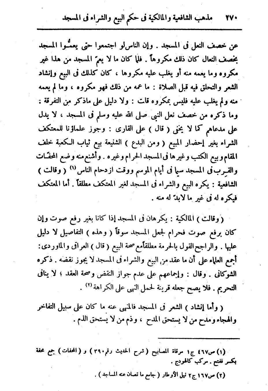 (وقالت) المالكية: يكرهان فى المسجد إذا كانا بغير رفع صوت وإن كان برفع صوت فحرام لجعل المسجد سوقاً (وهذه) التفاصيل لا دليل عيها. والراجح القول بالحرمة مطلقاً مع صحة البيع (اقل) العراقى والماوردى: أجمع العلماء على أن ما عقد من البيع والشراء فى المسجد لا يجوز نقضه. ذكره الشوكانى. وقال: وإجماعهم على عدم جواز النقض وصحة العقد، لا ينافى التحريم. فلا يصح جعله قرينة لحمل النهى على الكراهة (¬2).