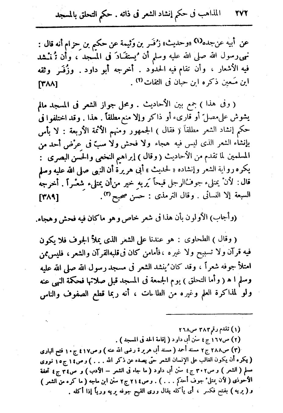 عن أبيه عن جده (¬1) " وحديث " زُفَر بن وَثيمة عن حكيم بنِ حزام أنه قال: نهى رسول الله صلى الله عليه وسلم أن يُستقَادَ فى المسجد، وان تُنْشد فيه الأشعار، وان تقام فيه الحدود. أخرجه أبو داود. وزُفَر وثقه ابن معَين ذكره ابن حبان فى الثقات (¬2). {388}
