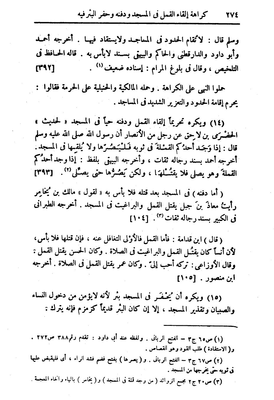 وسلم قال: لا تُقام الحدود فى المساجد ولا يستقاد فيها. أخرجه أحمد وأبو داود والدار قطنى والحاكم والبيهقى بسند لا بأس به. قاله الحافظ فى التلخيص، وقال فى بلوغ المرام: إسناده ضعيف (¬1). {392}