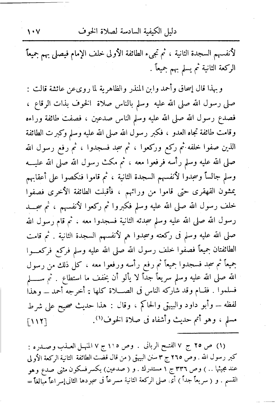 (¬1) ص 25 ج 7 الفتح الربانى. وص 115 ج 7 المنهل العذب وصدره: كبر رسول الله. وص 265 ج 3 سنن البيهقى (من قال قضت الطائفة الثانية الركعة الأولى عند مجيئها .. ) وص 336 ج 1 مستدرك. و (صدعين) بكسر فسكون مثنى صدع وهو القسم. و (سريعاً جداً) أى صلى الركعة الثانية مسرعاً فى سجودها الثانى إسراعاً مبالغاً فيه مع مراعاة ما يحصل به أقل الكمال (وحكمة) هذا الإسراع مخافة هجوم العدو خصوصاً حال السجود .. و (المشاركة فى كل الصلاة) باعتبار أن الطائفة الثانية قضت معظم الركعة التى فاتتها قبل سلام الإمام وسلمت بسلامه، فلا يرد أنها لم تشاركه فى الركعة إلا فى سجدة واحدة.