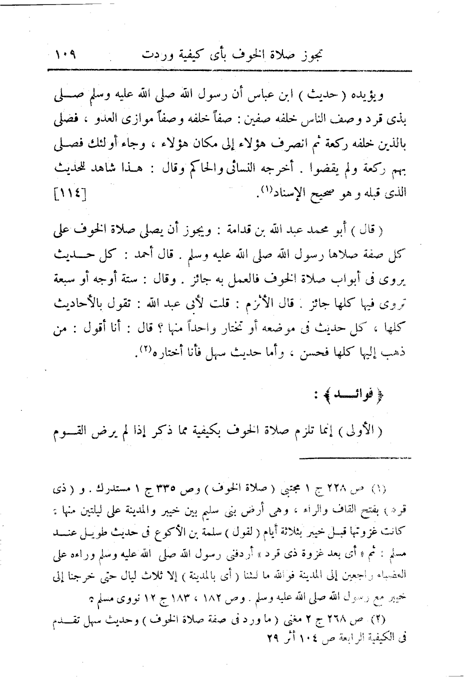 ويؤيده (حديث) ابن عباس أن رسول الله صلى الله عليه وسلم صلى بذى قرد وصف الناس خلفه صفين: صفاً خلفه وصفاً موازى العدو، فصلى بالذين خلفه ركعة ثم انصرف هؤلاء إلى مكان هؤلاء، وجاء أولئك فصلى بهم ركعة ولم يقضوا. أخرجه النسائي والحاكم وقال: هذا شاهد للحديث الذي قبله وهو صحيح الإسناد (¬1). [114].
