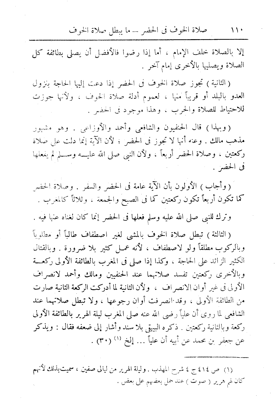 (الثالثة) تبطل صلاة الخوف بالمشي لغير اصطفاف طالباً او مطلوباً وبالركوب مطلقاً ولو لاصطفاف، لأنه عمل كثير بلا ضرورة. وبالقتال الكثير الزائد على الحاجة، وكذا إذا صلى فى المغرب بالطائفة الأولى ركعة وبالأخرى ركعتين تفسد صلاتهما عند الحنفيين ومالك وأحمد لانصراف الأولى فى غير أوان الانصراف، ولأن الثانية لما أدركت الركعة الثانية صارت من الطائفة الأولى، وقد انصرف أوان رجوعها، ولا تبطل صلاتهما عند الشافعي لما روى أن علياً رضى الله عنه صلى المغرب ليلة الهرير بالطائفة الأولى ركعة وبالثانية ركعتين. ذكره البيهقى بلا سند وأشار على ضعفه فقال: ويذكر عن جعفر بن محمد عن أبيه أن علياً .... إلخ (¬1) (30).