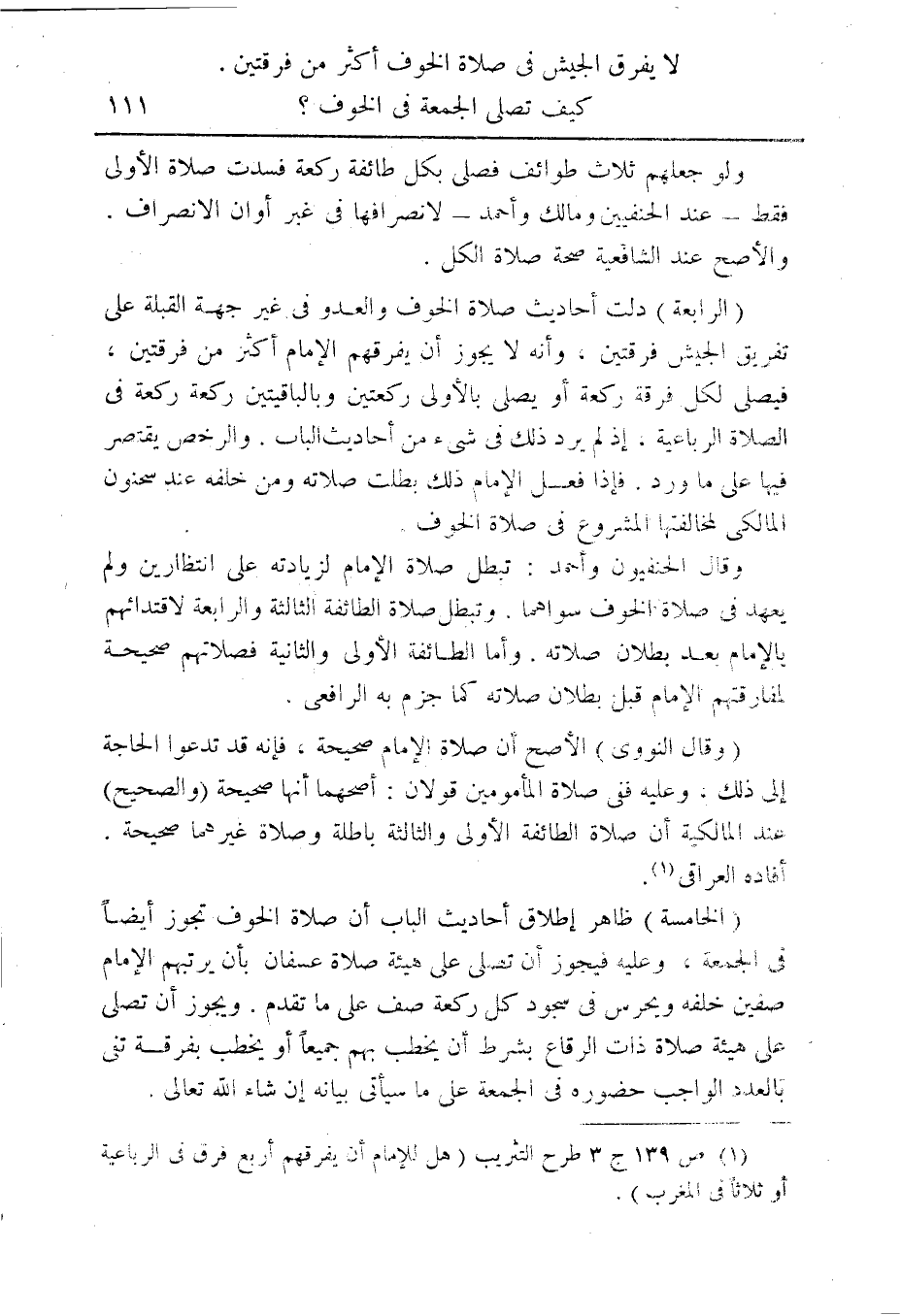 (وقال النووى) الأصح ان صلاة الإمام صحيحة، فإنه قد تدعوا الحاجة إلى ذلك، وعليه ففى صلاة المأمومين قولان: أصحهما أنها صحيحة (والصحيح) عند المالكية ان صلاة الطائفة الأولى والثالثة باطلة وصلاة غيرهما صحيحة. أفاده العراقى (¬1).