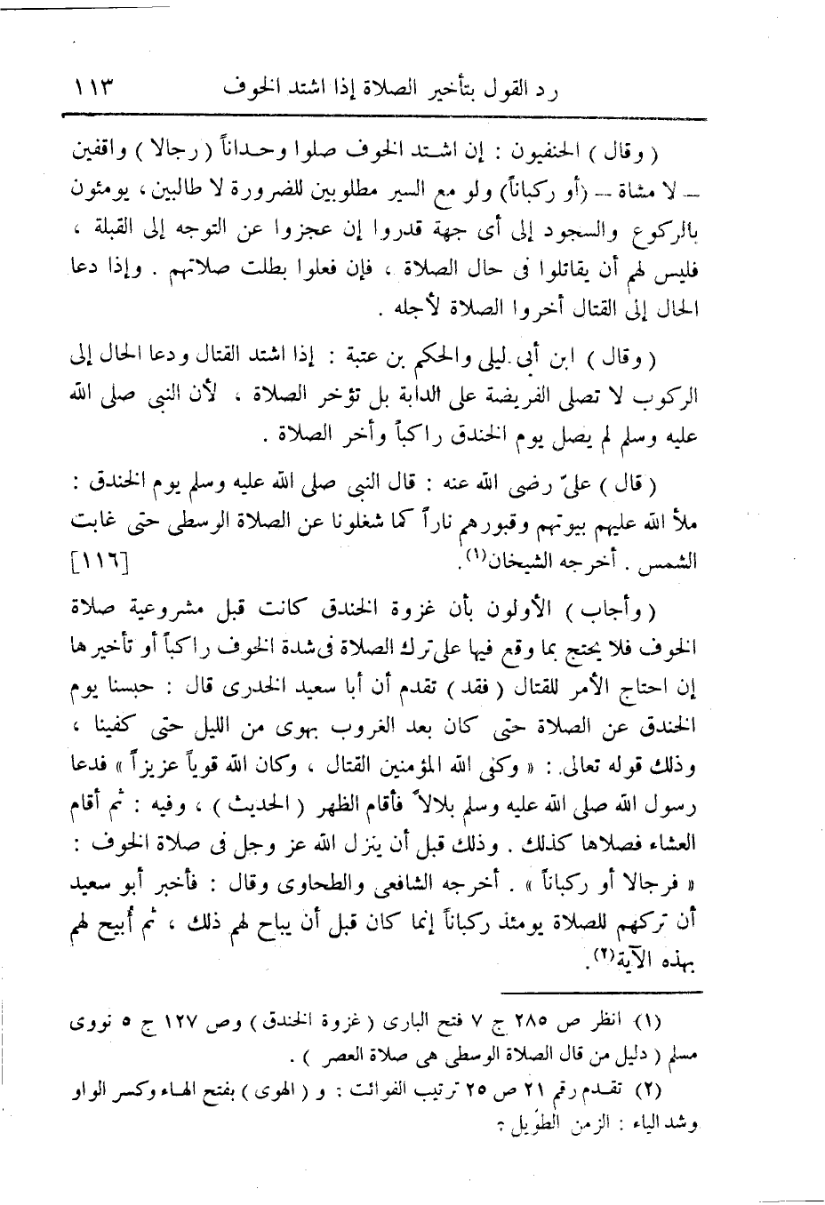 (وأجاب) الأولون بأن غزوة الخندق كانت قبل مشروعية صلاة الخوف فلا يحتج بما وقع فيها على ترك الصلاة فى شدة الخوف راكباً او تأخيرها إن احتاج الأمر للقتال (فقد) تقدم أن أبا سعيد الخدرى قال: حبسنا يوم الخندق عن الصلاة حتى كان بعد الغروب بهوى من الليل حتى كفينا وذلك قوله تعالى: {وَكَفَى اللَّهُ المُؤْمِنِينَ القِتَالَ وَكَانَ اللَّهُ قَوِياً عَزِيزاً} فدعا رسول الله صلى الله عليه وسلم بلالاً فأقام الظهر (الحديث)، وفيه: ثم أقام العشاء فصلاها كذلك. وذلك قبل أن ينزل الله عز وجل فى صلاة الخوف: {فَرِجَالاً أَوْ رُكْبَاناً}.أخرجه الشافعى والطحاوى وقال: فأخبر أبو سعيد أن تركهم للصلاة يومئذ ركباناً إنما كان قبل ان يباح لهم ذلك، ثم أُبيح لهم بهذه الآية (¬2).