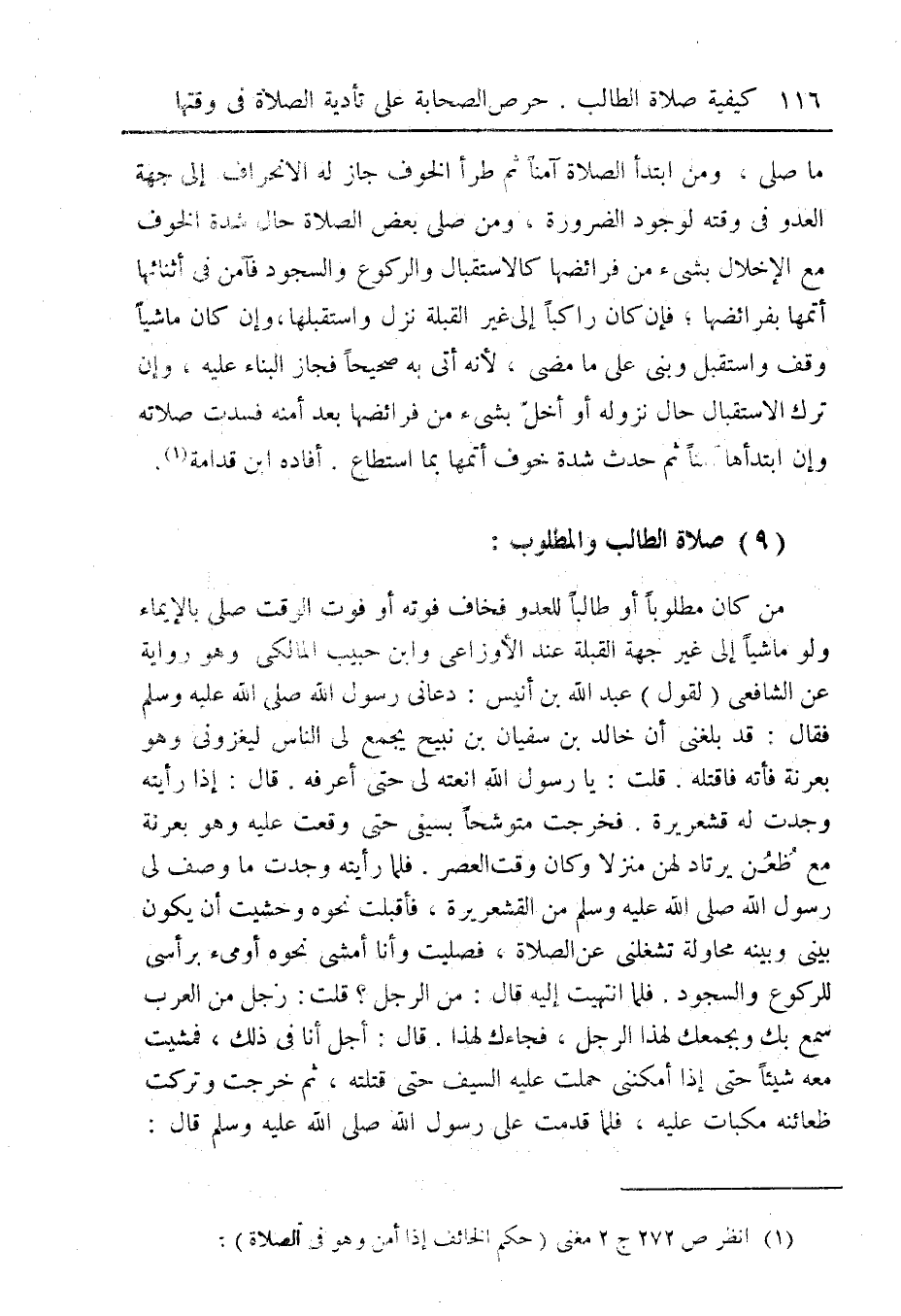 من كان مطلوباً أو طالباً للعدو فخاف فوته أوفوت الوقت صلى بالإيماء ولو ماشياً إلى غير جهة القبلة عند الأوزاعى وابن حبيسب المالكى وهو رواية عن الشافعى (لقول) عبد الله بن أنيس: دعانى رسول الله صلى الله عليه وسلم فقال: قد بلغنى أن خالد بن سفيان بن نبيح يجمع لى الناس ليغزونى وهو بعرنة فأته فاقتله. قلت: يا رسول الله انعته لى حتى أعرفه. قال: إذا رايته وجدت له قشعريرة. فخرجت متوشحاً بسيفى حتى وقعت عليه وهو بعرنة مع ظُعُن يرتاد لهن منزلا وكان وقت العصر. فلما رأيته وجدت ما وصف لى رسول الله صلى الله عليه وسلم منالقشعريرة، فأقبلت نحوه وخشيت أن يكون بينى وبينه محاولة تشغلنى عن الصلاة، فصليت وأنا أمشى نحوه أومئ برأسى للركوع والسجود. فلما انتهيت إليه قال: من الرجل؟ قلت: رجل من العرب سمع بك وبجمعك لهذا الرجل، فجاءك لهذا. قال: أجل انا فى ذلك، فمشيت معه شيئاً حتى إذا أمكننى حملت عليه السيف حتى قتلته، ثم خرجت وتركت ظعائنه مكبات عليه، فلما قدمت على رسول الله صلى الله علييه وسلم قال: