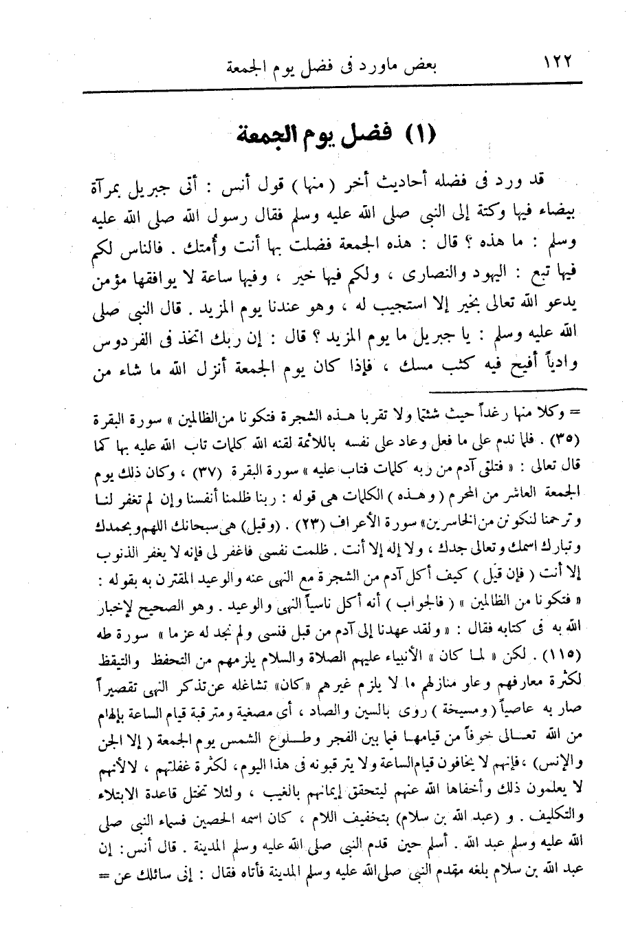 = وكلا منها رغداً حيث شئتما ولا تقربا هذه الشجرة فتكونا من الظالمين " سورة البقرة (35). فلما ندم على ما فعل وعاد على نفسه باللائمة لقنه الله كلمات تاب الله عليه بها كما قال تعالى: " فتلقى آدم من ربه كلمات فتاب عليه <" سورة البقرة (37)، وكان ذلك يوم الجمعة العاشر من المحرم (وهذه) الكلمات هى قوله: ربنا ظلمنا أنفسنا وإن لم تغفر لنا وترحمنا لنكونن من الخاسرين " سورة الأعراف (23). (وقيل) هى سبحانك اللهم وبحمدك وتبارك اسمك وتعالى جدك، ولا إله إلا أنت. ظلمت نفسى فاغفر لى فإنه لا يغفر الذنوب إلا أنت (فإن قيل) كيف أكل آدم منالشجرة مع النهى عنه والوعيد المقترن به بقوله: " فتكونا من الظالمين" (فالجواب) أنه أكل ناسياً النهى والوعيد. وهو الحيح لإخبار الله به فى كتابه فقال: " ولقد عهدنا إلى آدم من قبل فنسى ولم نجد له عزما " سورة طه (115). لكن " لما كان" الأنبياء عليهم الصلاة والسلام يلزمهم من التحفظ والتيقظ لكثرة معارفهم وعاو منازلهم. لا يلزم غيرهم " كان" تشاغله عن تذكر النهى تقصيراً صار به عاصياً (ومسيخة) روى بالسين والصاد، أى مصغية ومترقبة قيام الساعة بإلهام من الله تعالى خوفاً من قيامها فيما بين الفجر وطلوع الشمس يوم الجمعة (إلا الجن والإنس)، فإنهم لا يخافون قيام الساعة ولا يترقبونه فى هذا اليوم، لكثرة غفلتهم، لا لأنهم لا يعلمون ذلك وأخفاها الله عنهم ليتحقق إيمانهم بالغيب، ولئلا تختل قاعدة الابتلاء والتكليف. و (عبد الله بن سلام) بتخفيف اللام، كان اسمه الحصين فسماء النبى صلى الله عليه وسلم عبد الله. اسلم حين قدم النبى صلىالله عليه وسلم المدينة. قال أنس: إن عبد الله بن سلام بلغه مقدم النبى لى الله عليه وسلم المدينة فأتاه فقال: إنى سائلك عن =