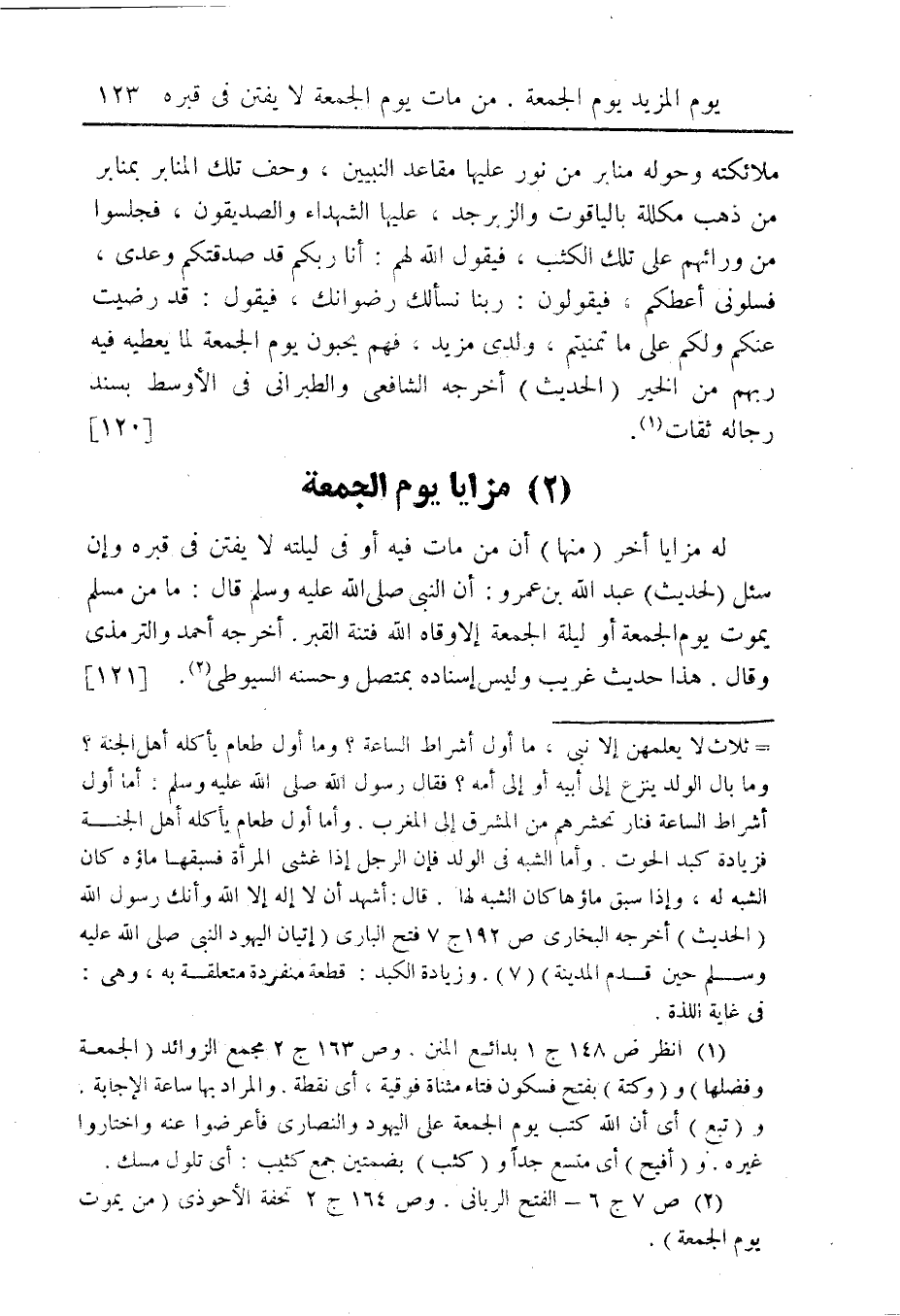 له مزايا أخر (منها) أن من مات فيه أو فى ليلته لا يفتن فى قبره وإن سئل (لحديث) عبد الله بن عمرو: أن النبى صلى الله عليه وسلم قال: ما من مسلم يموت يوم الجمعة أو ليلة الجمعة إلا وقاه الله فتنة القبر. أخرجه أحمد والترمذى وقال. هذا حديث غريب وليس إسناده بمتصل وحسنه السيوطى (¬2). [121].