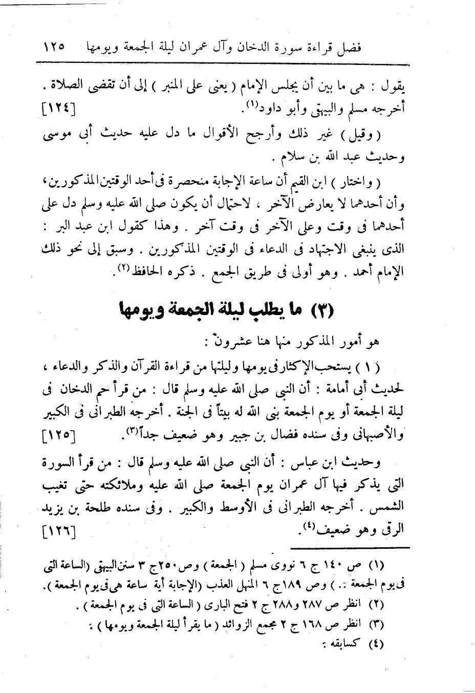 (¬1) ص 140 ج 6 نووى مسلم (الجمعة) وص 250 ج 3 سننالبيهقى (الساعة التى فى يوم الجمعة .. ) وص 189 ج 6 المنهل العذب (الإجابة اية ساعة هى فى يوم الجمعة).