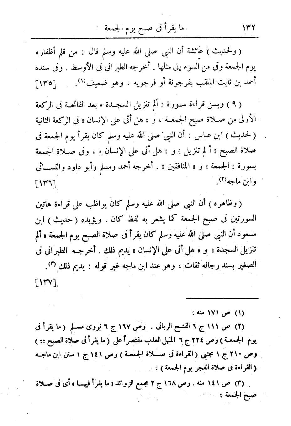 (¬2) ص 111 ج 6 الفتح الربانى. وص 167 ج 6 نووى مسلم (ما يقرأ فى يوم الجمعة) وص 224 ج 6 المنهل العذب مقتصراً على (ما يقرأ فى صلاة الصبح .. ) وص 210 ج 1 مجتبى (القراءة فى صلاة الجمعة) وص 141 ج 1 سنن ابن ماجه (القراءة فى صلاة الفجر يوم الجمعة).