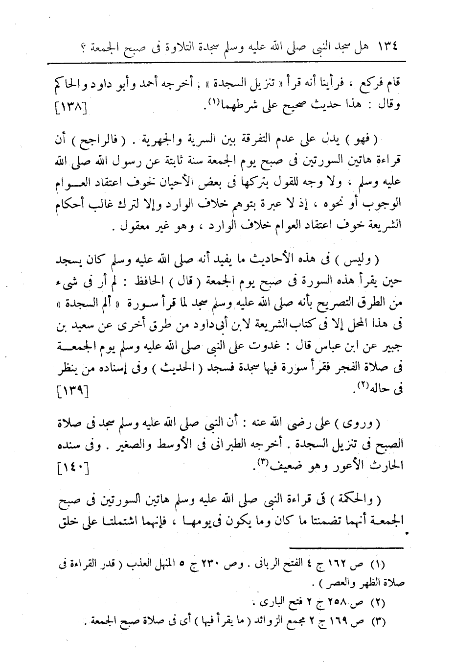 (وليس) فى هذه الأحاديث ما يفيد أنه صلى الله عليه وسلم كان يسجد حين يقرأ هذه السورة فى صبح يوم الجمعة (قال) الحافظ: لم أر فى شئ من الطرق التصريح بأنه صلى الله عليه وسلم سجد لما قرأ سورة " ألم السجدة" فى هذا المحل إلا فى كتاب الشريعة لابن أبى داود من طرق أخرى عن سعيد بن جبير عن ابن عباس قال: غدوت علىالنبى صلى الله عليه وسلم يوم الجمعة فى صلاة الفجر فقرأ سورة فيها سجدة فسجد (الحديث) وفى إسناده من ينظر فى حاله (¬2). [139].