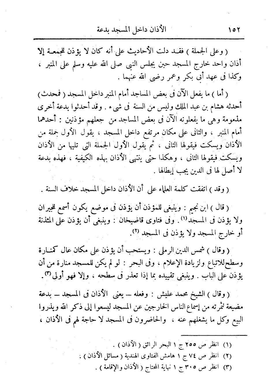 (وقال) الشيخ محمد عليش: وفعله- يعنى الأذان فى المسجد- بدعة مضيعة لثمرته من إسماع الناس الخارجين عن المسجد ليسعوا إلى ذكر الله ويذروا البيع وكل ما يشغلهم عنه نوالحاضرون فى المسجد لا حاجة لهم فى الأذان،