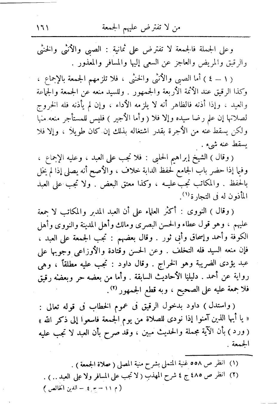 (¬2) انظر ص 485 ج 4 شرح المهذب (لا تجب على المسافر ولا على العبد .. ).