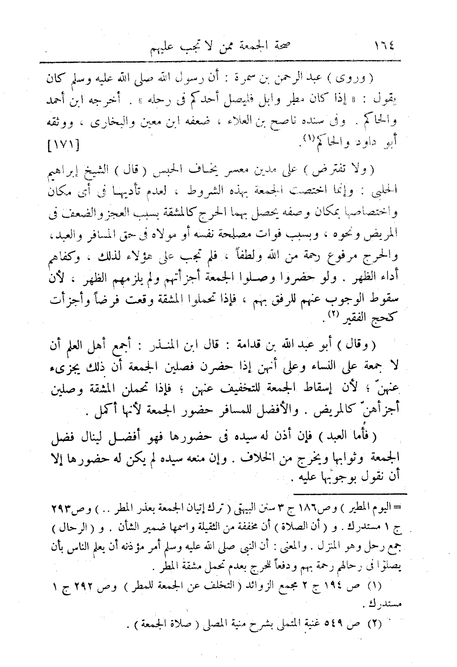 (وروى) عبد الرحمن بن سمرة: أن رسول الله صلى الله عليه وسلم كان يقول: " إذا كان مطر وابل فليصل أحدكم فى رحله ". أخرجه ابن أحمد والحاكم. وفى سنده ناصح بن العلاء، ضعفه ابن معين والبخارى، ووثقه ابو داود والحاكم (¬1). [171].