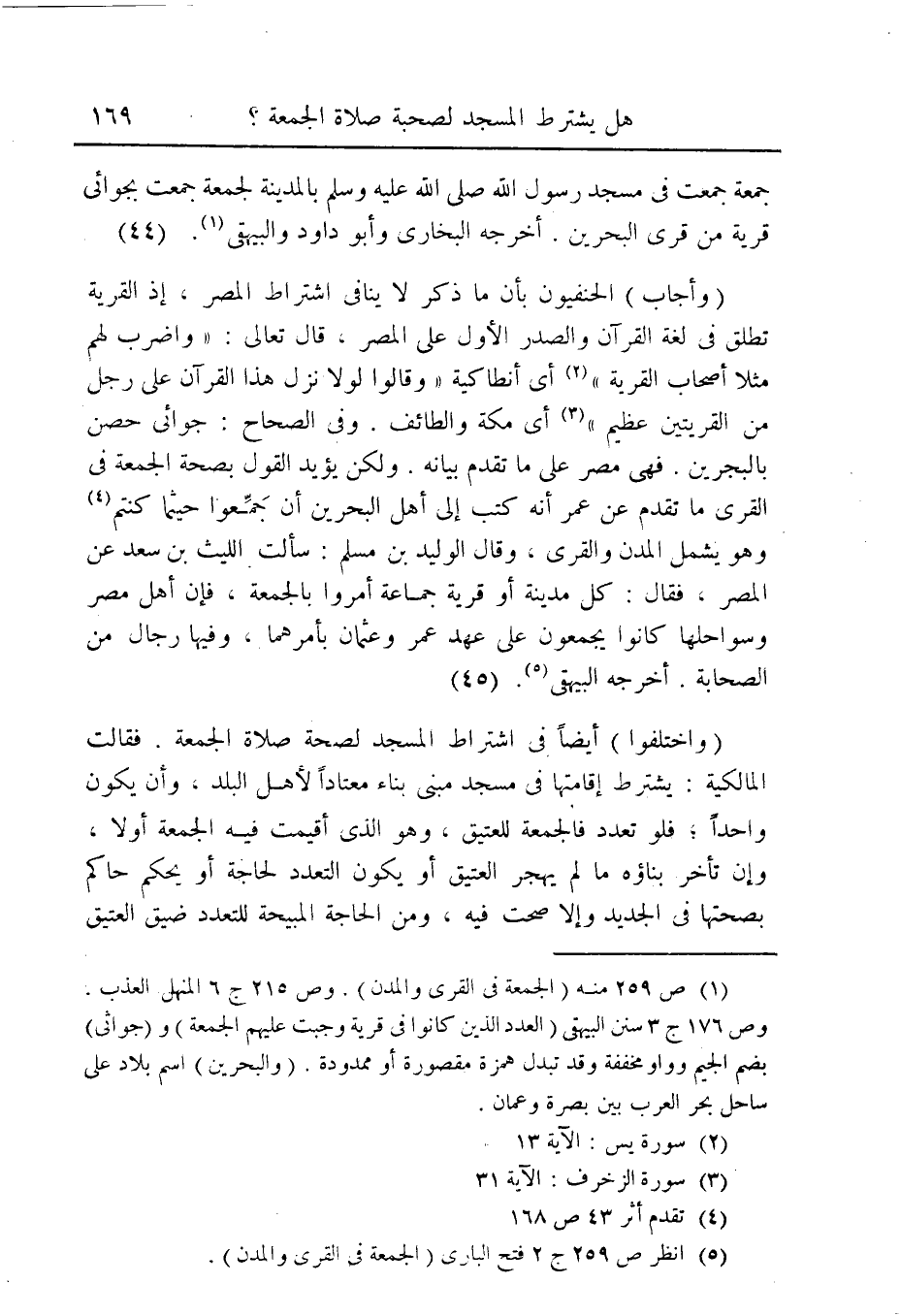 (وأجاب) الحنفيون بأن ما ذكر لا ينافى اشتراط المصر، إذ القرية تطلق فى لغة القرآن والصدر الأول على المصر، قال تعالى: {وَاضْرِبْ لَهُم مَّثَلاً أَصْحَابَ القَرْيَةِ} (¬2) أى أنطاكية {وَقَالُوا لَوْلا نُزِّلَ هَذَا القُرْآنُ عَلَى رَجُلٍ مِّنَ القَرْيَتَيْنِ عَظِيمٍ} (¬3) أى مكة والطائف. وفى الصحاح: جوائى حصن بالبحرين. فهى مصر على ما تقدم بيانه. ولكن يؤيد القول بصحة الجمعة فى القرى ما تقدم عن عمر أنه كتب إلى أهل البحرين ان جَمَّمعوا حيثما كنتم (¬4) وهو يشمل المدن والقرى، وقال الوليد بن مسلم: سألت الليث بن سعد عن المصر، فقال: كل مدينة أو قرية جماعة أمروا بالجمعة، فإن أهل مصر وسواحلها كانوا يجمعون على عهد عمر وعثمان بأمرهما، وفيها رجال من الصحابة. أخرجه البيهقى (¬5). (45).