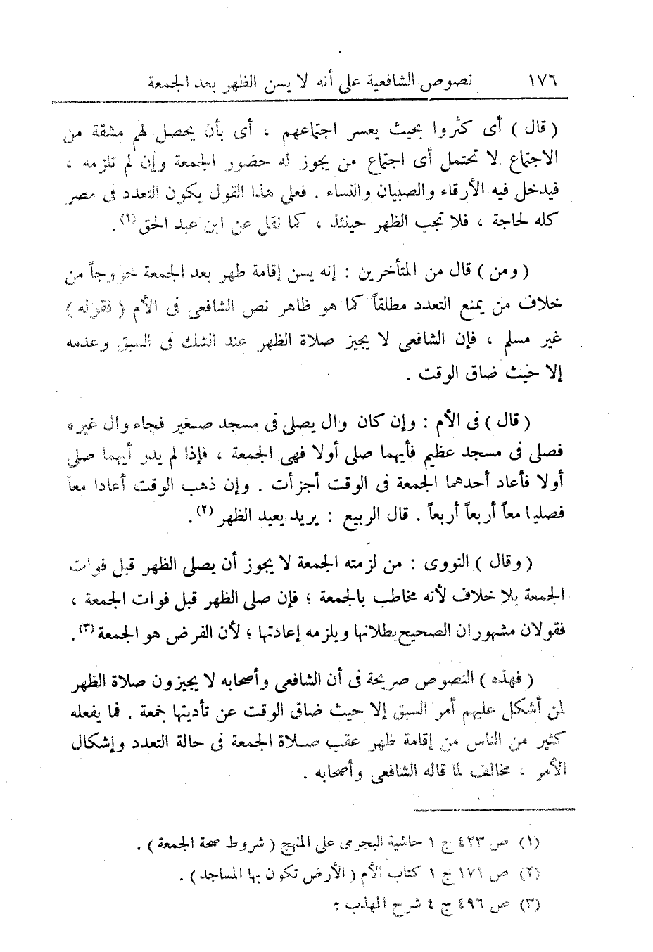 (فهذه) النصوص صريحة في أن الشافعي وأصحابه لا يجيزون صلاة الظهر لمن أشكل عليهم أمر السبق إلا حيث ضاق الوقت عن تأديتها جمعة. فما يفعله كثير من الناس إقامة ظهر عقب صلاة الجمعة في حالة التعدد وإشكال الأمر، مخالف لما قاله الشافعي وأصحابه.