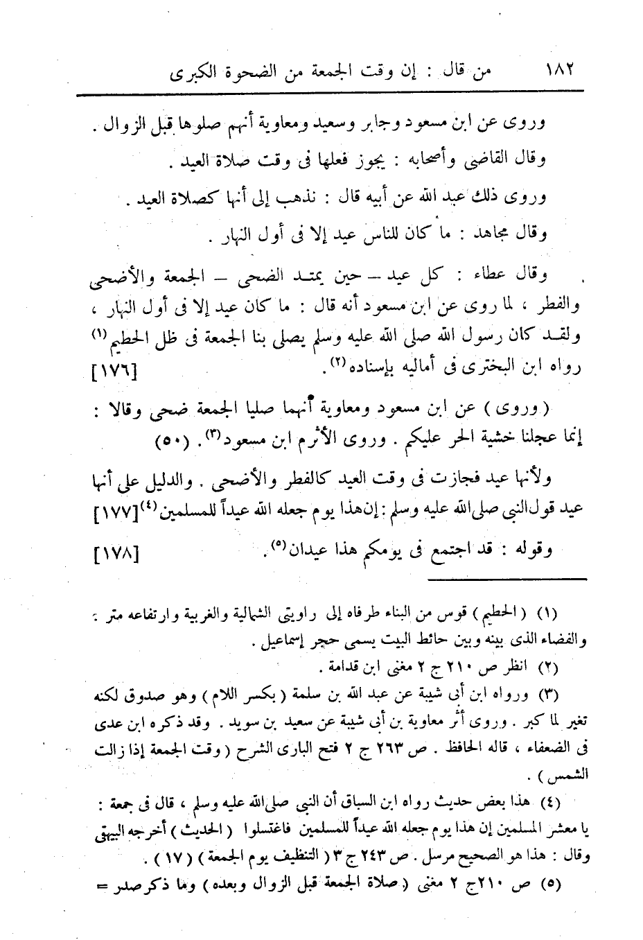 وقال عطاء: كل عيد - حين يمتد الضحى - الجمعة والأضحى والفطر، لما روى عن بن مسعود أنه قفال ك ما كالن عيد إلا فى اول النهار، ولقد كان رسول الله صلى الله عليه وسلم يصلى بنا الجمعة فى ظل الحطيم (¬1) رواه ابن البخترى فى أماليه بإسناده (¬2). [176].