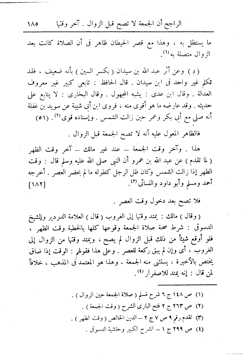 (د) وعن أثر عبد الله بن سيدان (بكسر السين) بأنه ضعيف، فقد تكلم غير واحد فى ابن سيدان. قال الحافظ: تابعى كبير غير معروف العدالة. وقال ابن عدى: يشبه المجهول. وقال البخارى: لا يتابع على حديثه. وقد عارضه ما هو أقوى منه. فروى ابن ابى شيبة عن سويد بن غفلة أنه صلى مع ابى بكر وعمر حين زالت الشمس. وإسناده قوى (¬2). (51).