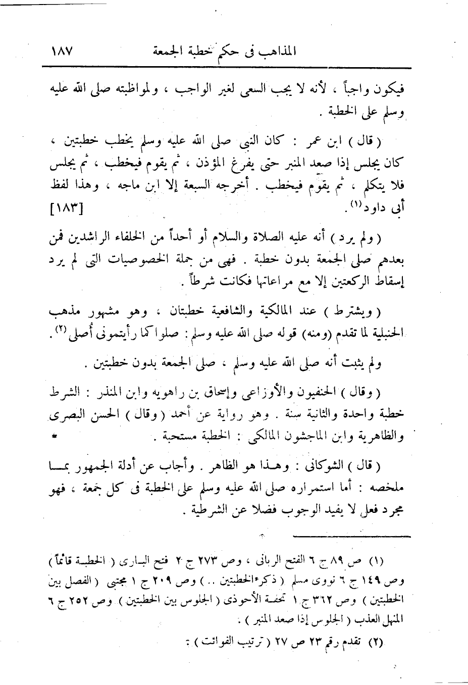 (¬1) ص 89 ج 6 الفتح الربانى، وص 273 ج 2 فتح البارى (الخطبة قائماً) وص 149 ج 6 نووى مسلم (ذكر الخطبتين .. ) وص 209 ج 1 مجتبى (الفصل بين الخطبتين) (وص 362 ج 1 تحفة الأحوذى 0 الجلوس بين الخطبتين) وص 252 ج 6 المنهل العذب (الجلوس إذا صعد المنبر).