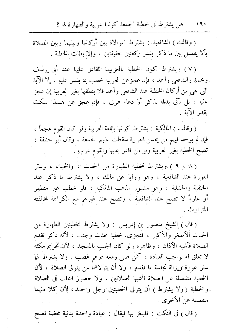 (8، 9) ويشترط للخطبة الطهراة من الحدث، والخبث، وستر العورة عند الشافعية، وهو رواية عن مالك، ولا يشترط ما ذكر عند الحنفية والحنبلية، وهو مشهور مذهب المالكية، فلو خطب غير متطهر او عارياً لا تصح عند الشافعية، وتصح عند غيرهم مع الكراهة لمخالفته المتوارث.