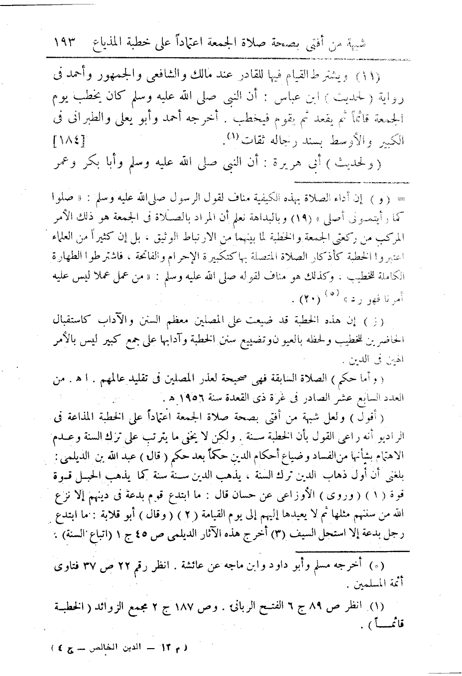 (اقول) ولعل شبهة من أفتى بصحة صلاة الجمعة اعتماداً على الخطبة المذاعة فى الرادية أنه راعى القول بأن الخطبة سنة. ولكن لا يخفى ما يترتب على ترك السنة وعدم الاهتمام بشأنها من الفساد وضياع أحكام الدين حكماً بعد حكم (قال) عبد الله بن الديلمى: بلغنى أن أول ذهاب الدين ==ترك السنة، يذهب الدين سنة سنة كما يذهب فى دينهم إلا نزع الله من سننهم مثلها ثم لا يعيدها إليهم إلى يوم القيامة (2) (وقال) ابو قلابة: ما ابتدع رجل بدعة إلا استحل السيف (3) أخرج هذه الاثار الديلمى ص 45 ج 1 (.اتباع السنة).